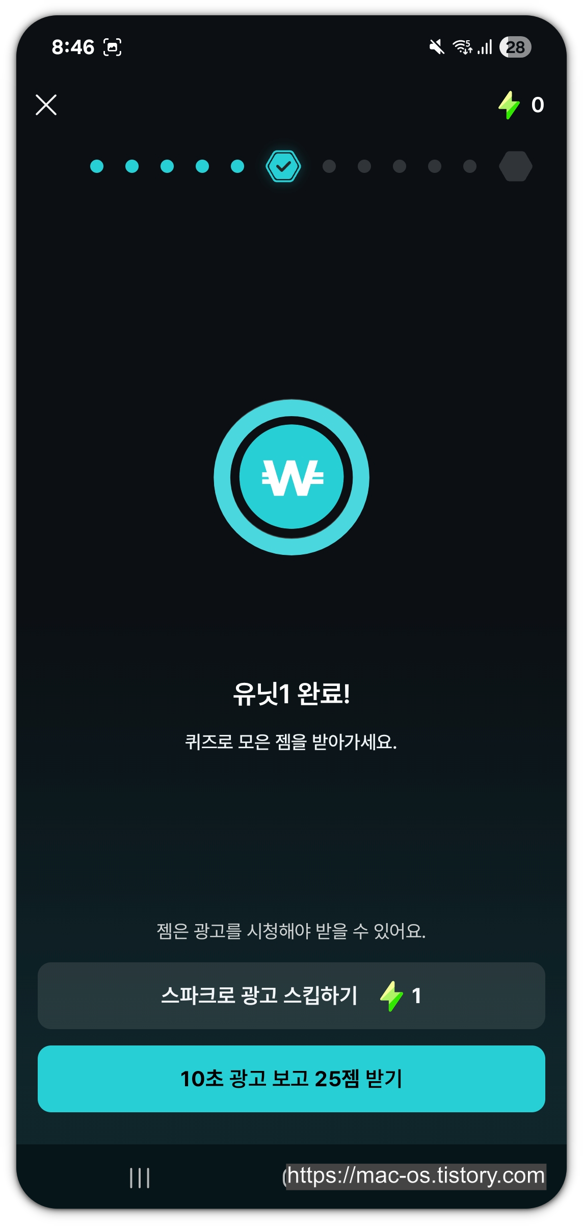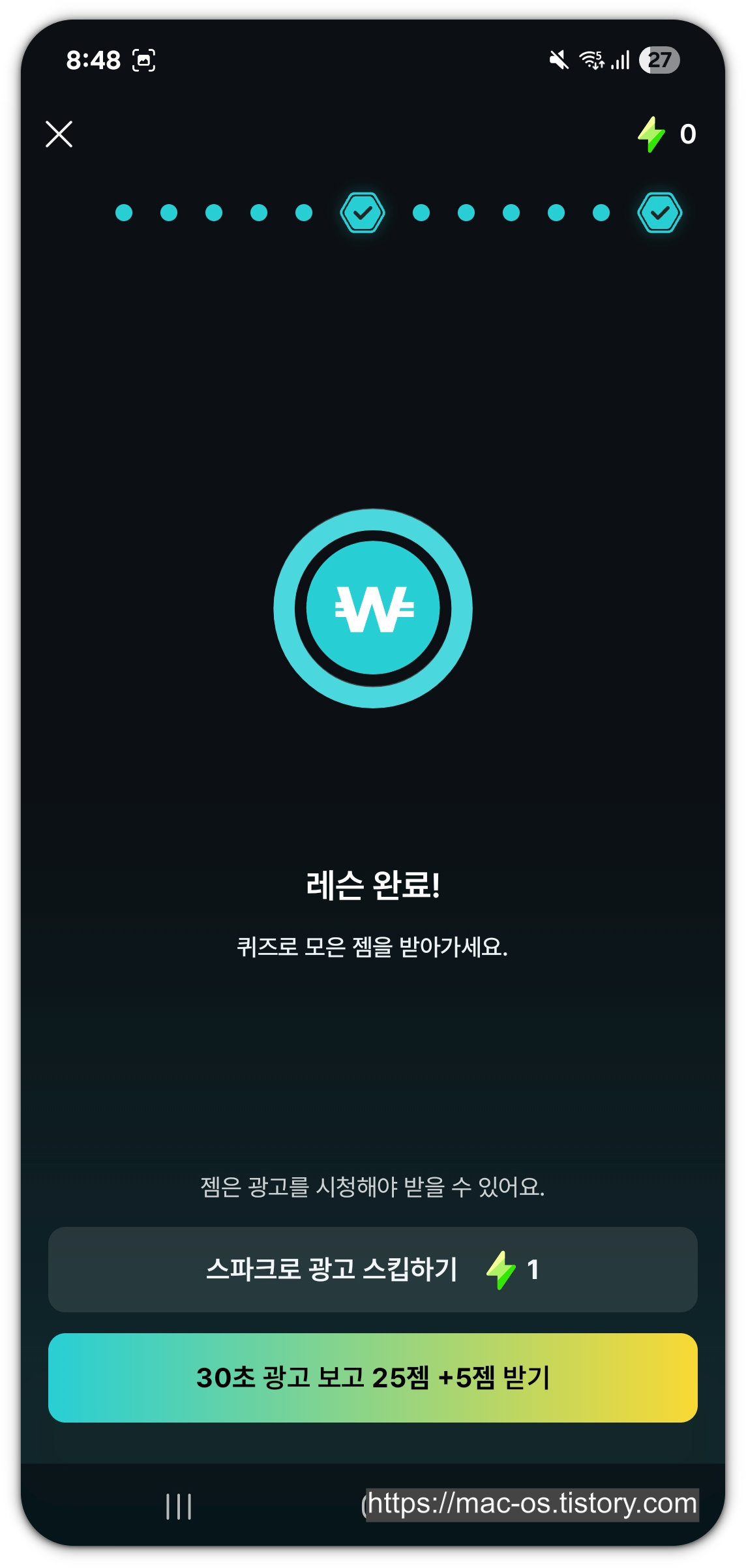 총 10문제가 있는데, 한 문제를 풀 때마다 5젬씩 쌓이고, 5문제마다 10초 광고를 봐야 합니다. '스파크'라는 것도 있는데, 이건 하루에 레슨 3개를 완료하면 주어지는 재화입니다. 스파크를 사용하면 5문제마다 등장하는 광고를 스킵할 수 있습니다.