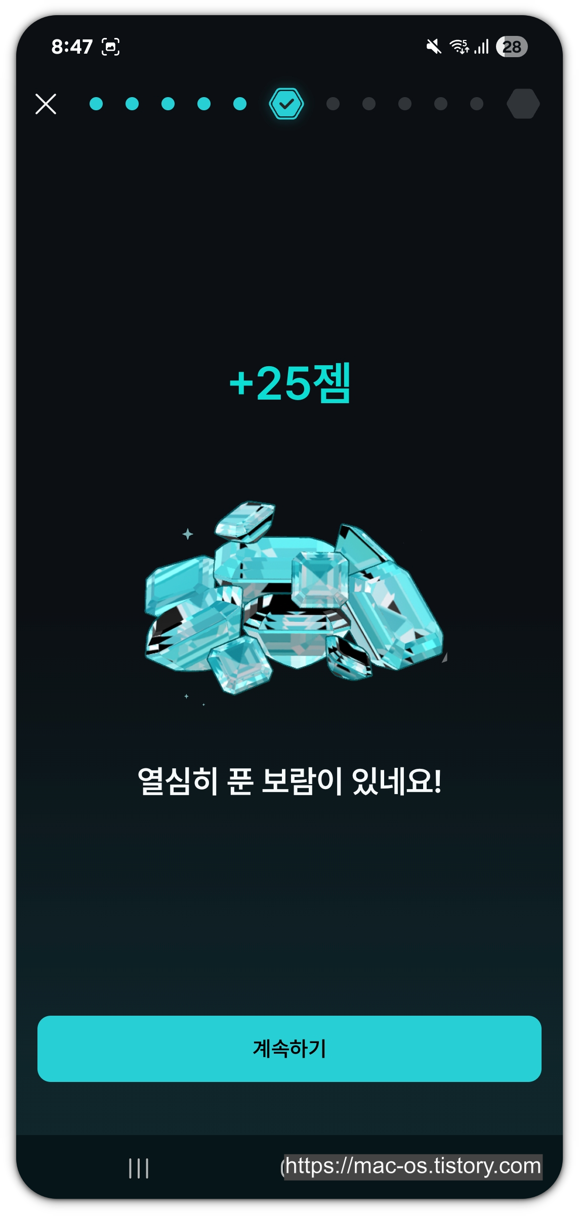 광고를 시청하고 [계속하기] 버튼을 누르고 남은 5문제를 모두 풀었습니다. 그러면 레슨이 완료되는데요. 여기서 [30초 광고 보고 25젬 +5젬 받기] 버튼을 누릅니다.