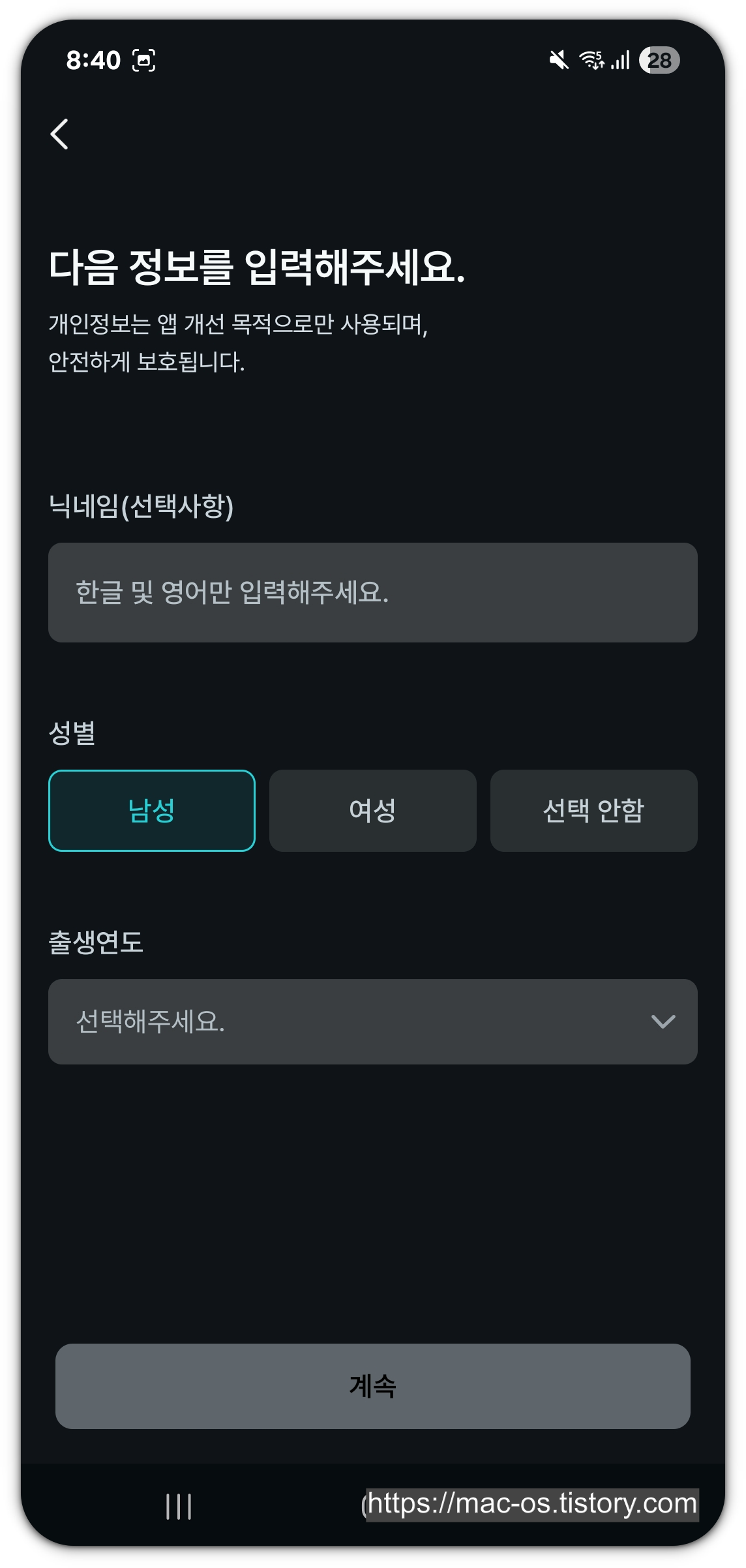 닉네임, 성별, 출생연도를 입력하고 [계속] 버튼을 누르면 친구 코드 입력 페이지로 이동됩니다. 여기서 친구 코드 칸에 ALSODYGJ를 복사해서 붙여넣기 하시면 500포인트를 받으실 수 있습니다. (500젬 = 500원)