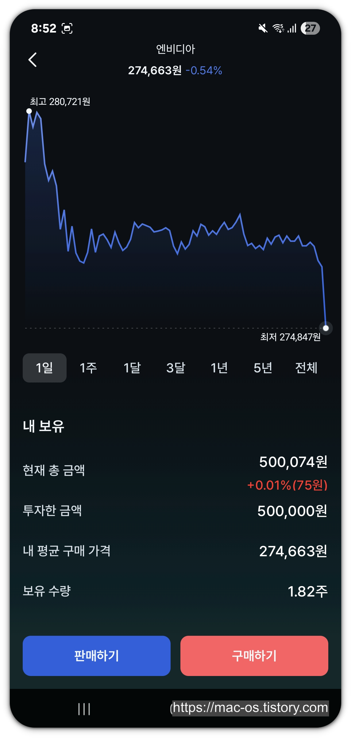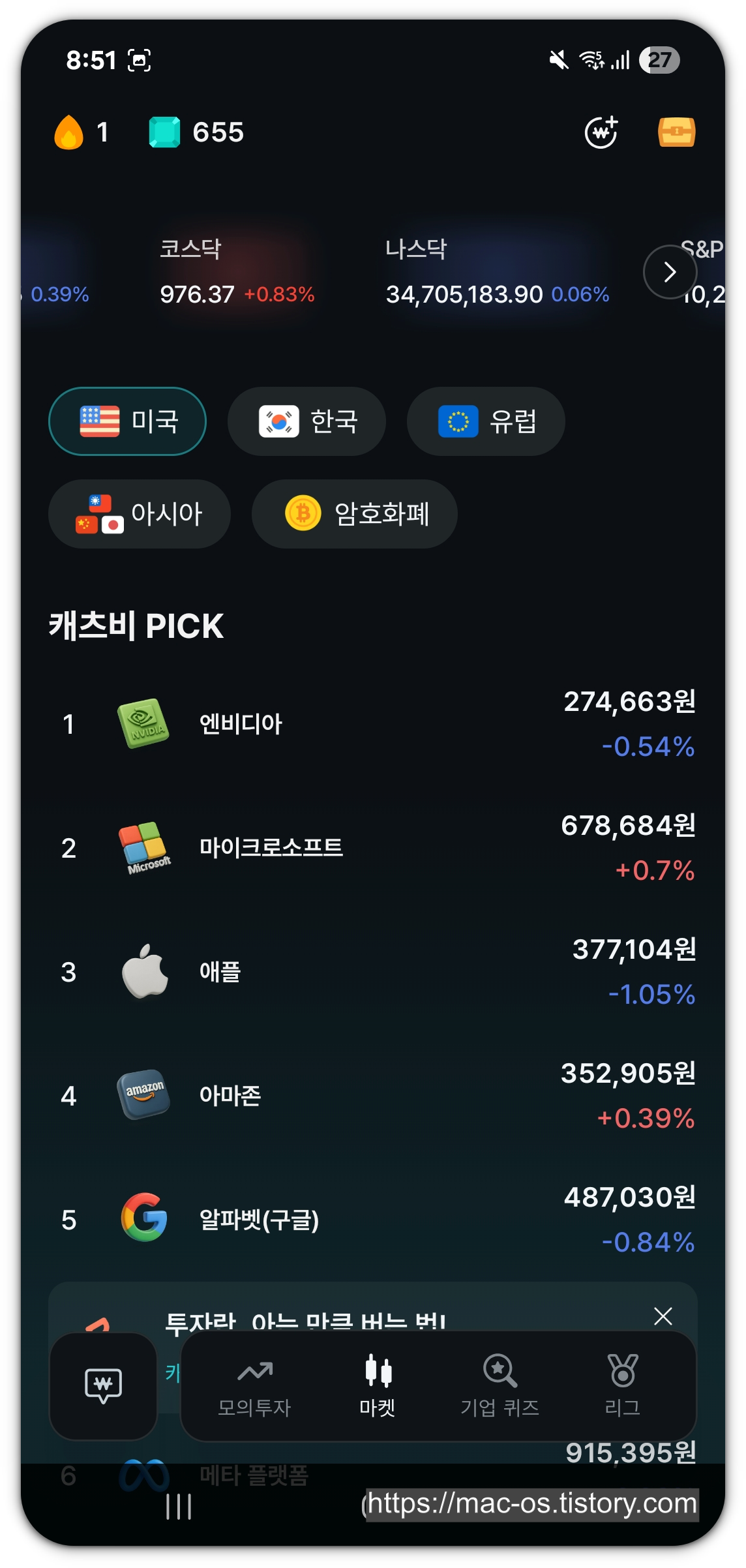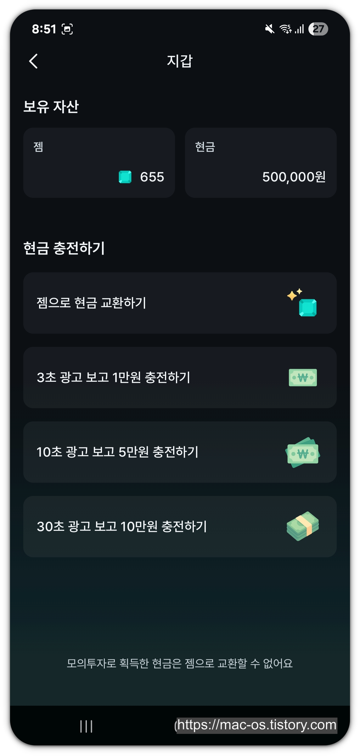캐츠비에는 모의투자 기능도 있는데요. 처음 이 페이지로 이동하면 50만원을 줍니다. 50만원은 실제 돈이 아니라 가상의 화폐입니다. 이 돈을 가지고 여러 기업의 주식을 매수/매도할 수 있습니다. 광고를 시청하면 현금을 충전하는 기능도 있네요.