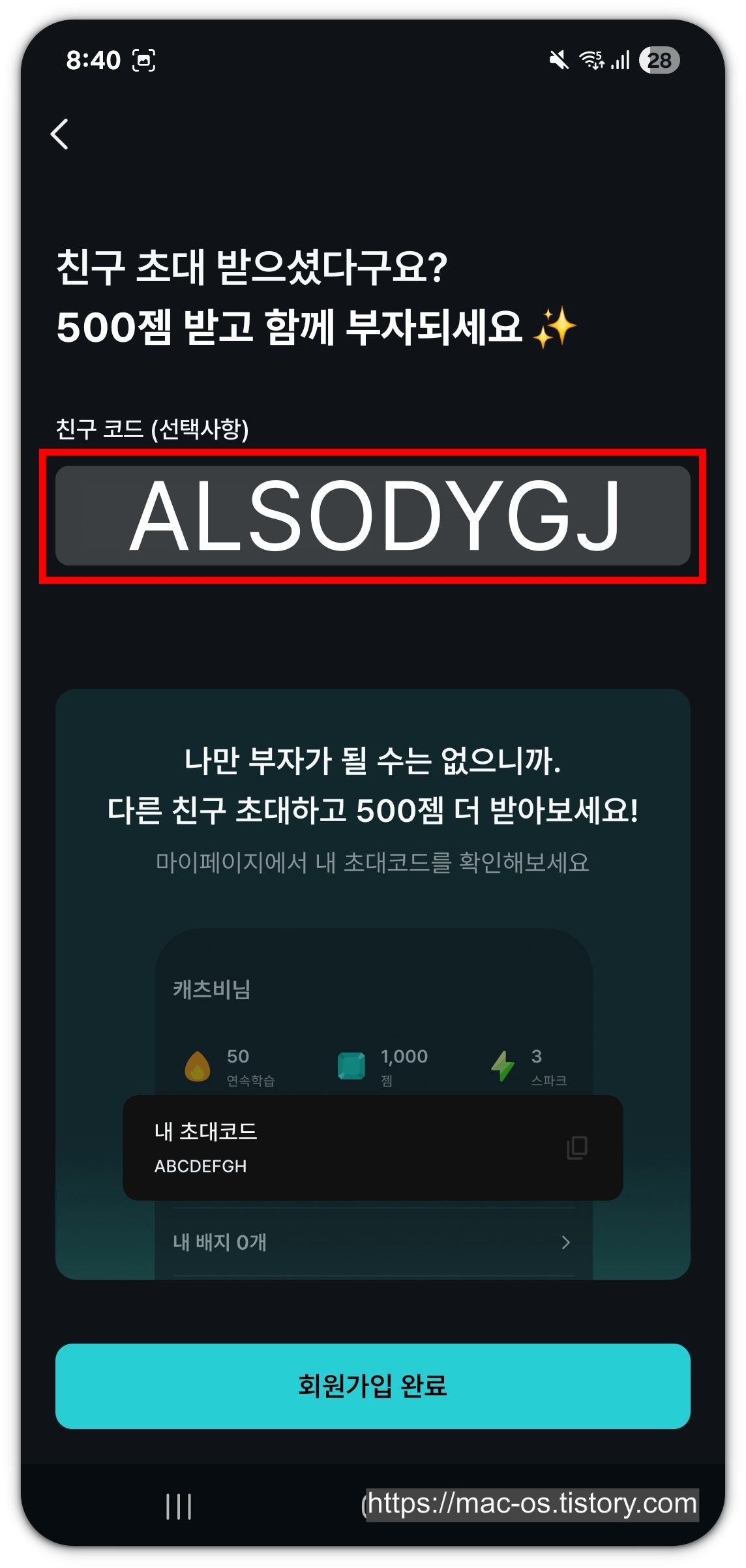 캐츠비 회원가입할 때 마지막에 친구코드 칸에 ALSODYGJ를 입력하시면 500포인트를 받고 가입하실 수 있습니다.
