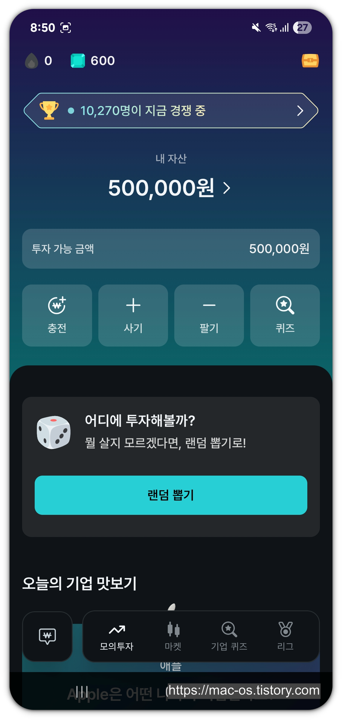 저는 50만원을 가지고 엔비디아 주식을 구매해봤습니다. 이 모의투자 페이지에선 여러 기업의 퀴즈를 풀고 보상으로 젬을 받는 기능도 있었습니다. (아까 레슨과 비슷함). 하단 탭을 보시면 리그에서 모의투자 랭킹도 있습니다.
