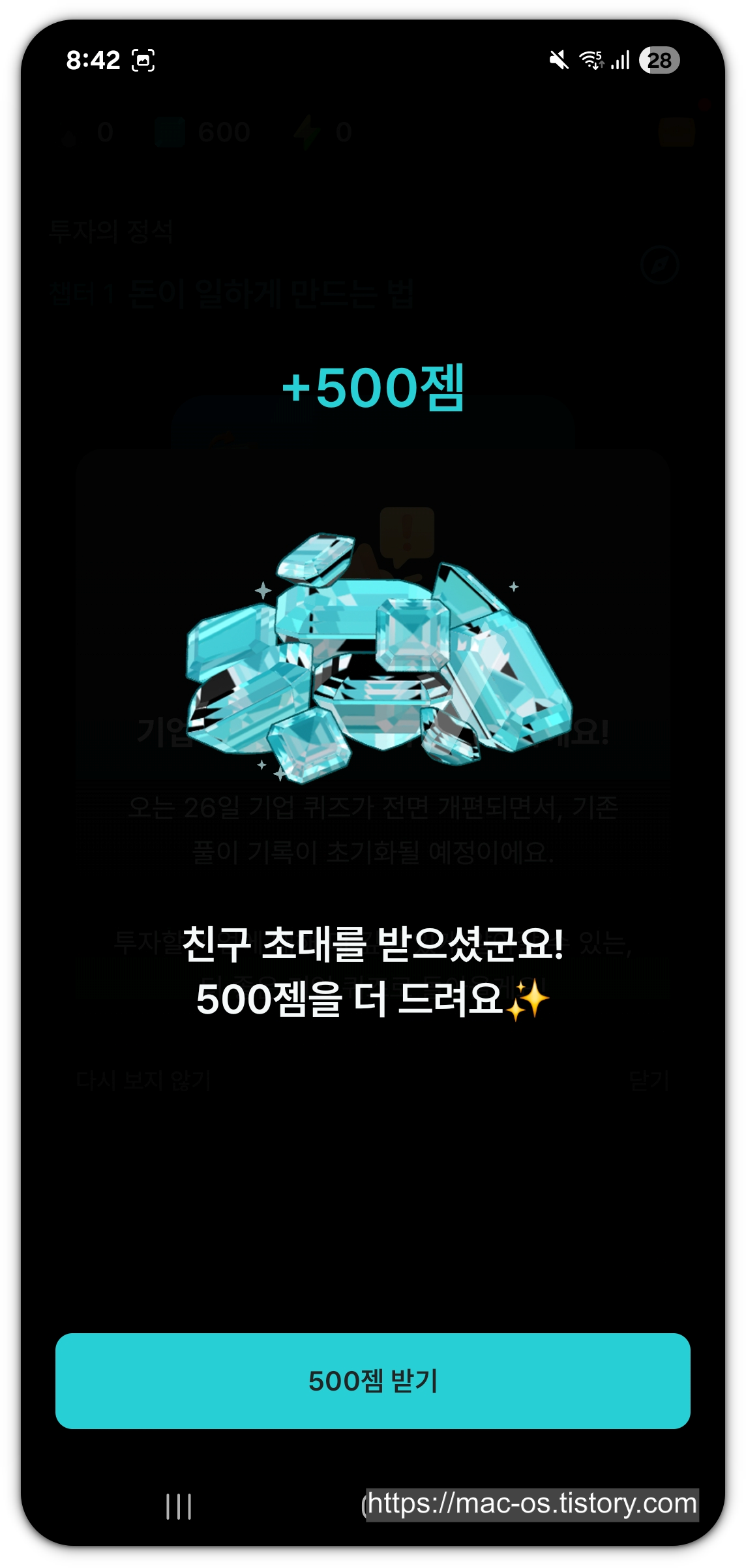 저도 친구코드를 입력하고 500젬을 받고 시작했습니다. 회원가입을 마치면 오른쪽 사진과 같은 화면이 됩니다.