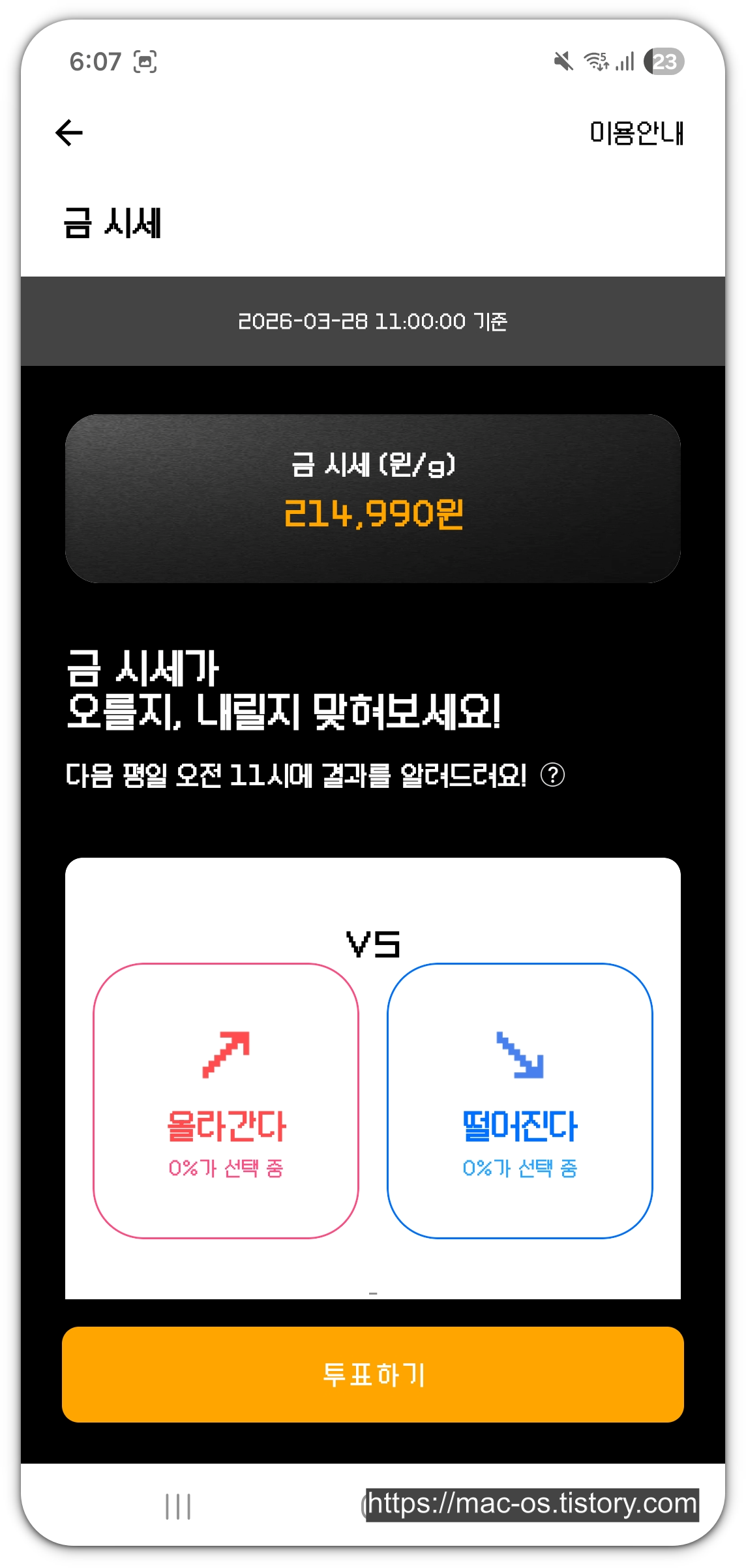 금 시세 페이지에서 금이 오를지, 내릴지 투표하면 보상으로 금방망이를 받을 수도 있구요. 연속으로 맞추면 더 좋은 보상을 받게 됩니다.