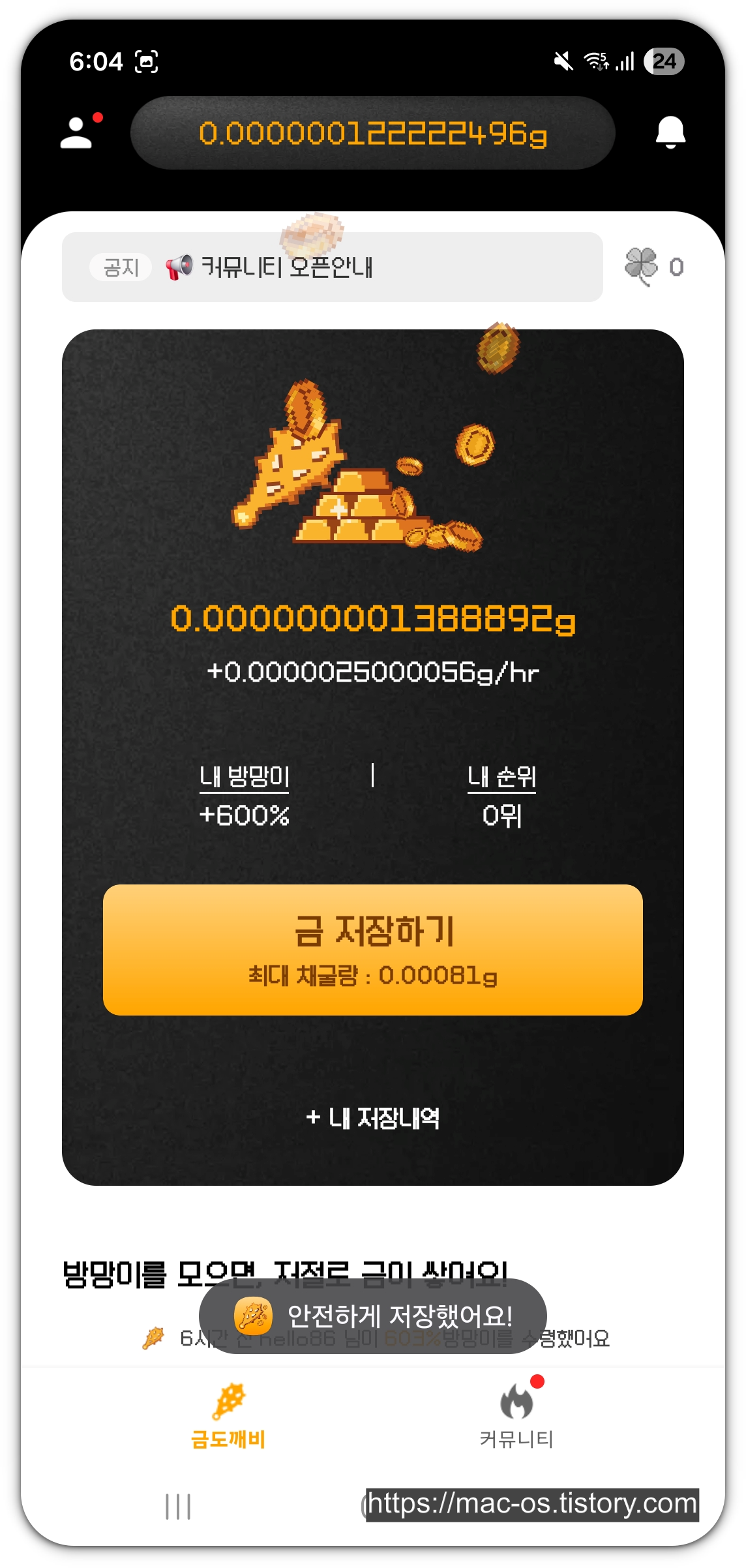 보통 이런 금캐기 앱테크에선 최대 시간을 8시간이나 6시간 정도로 해서, 사용자가 금 저장을 위해 자주 앱에 접속하도록 유도하는데, 이 앱은 특이하게도 최대 채굴량이 매우 높아, 사용자 경험에 관대한 정책을 제공하고 있습니다. (채굴 속도가 증가하면, 이 최대 채굴량도 비례해서 증가하는지, 아니면 고정되어 있는 건지는 모르겠습니다.)