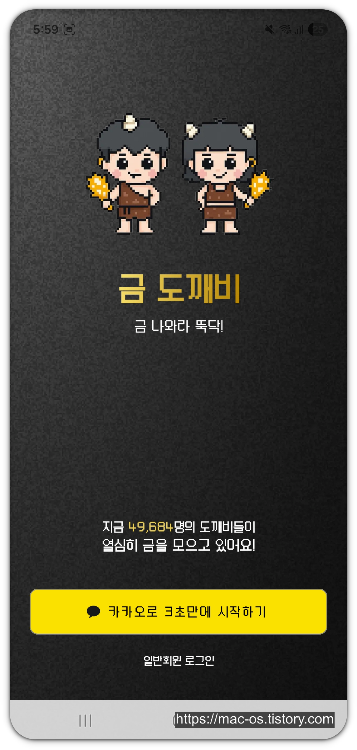 금도깨비는 구글 플레이 스토어와 앱스토어에서 설치하실 수 있습니다. 앱을 설치하고, [카카오로 3초만에 시작하기] 버튼을 터치합니다.