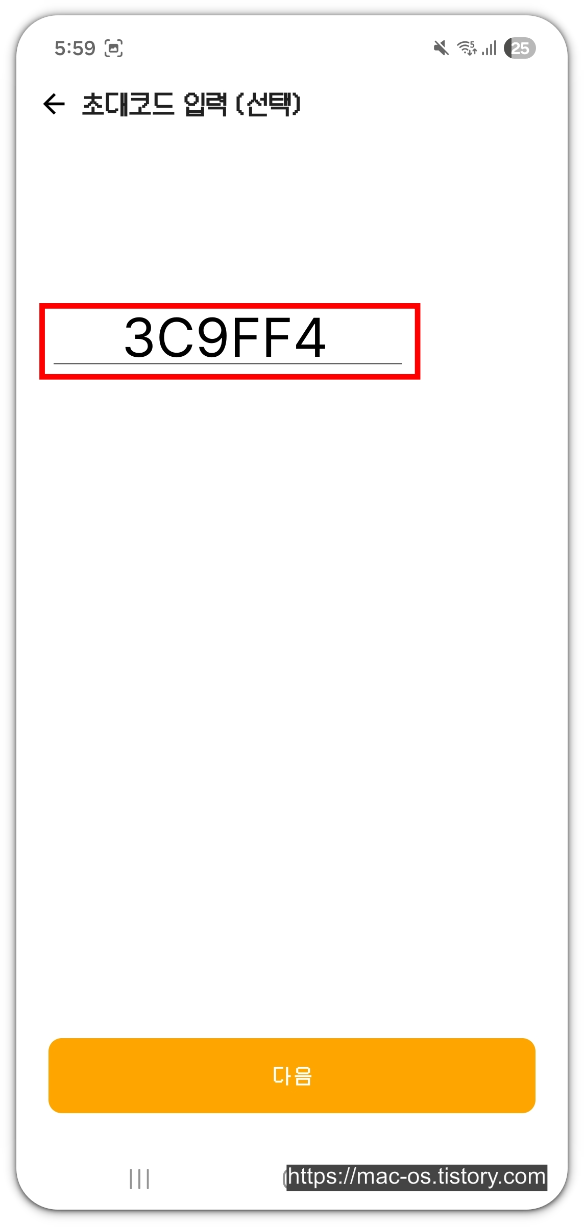 이용약관에 동의하고 초대코드를 입력합니다. 초대코드를 입력하면, 채굴 속도 +500% 방망이(30일)를 얻을 수 있습니다. 초대코드가 없으신 분들은 3C9FF4를 복사해서 입력하시면 됩니다.