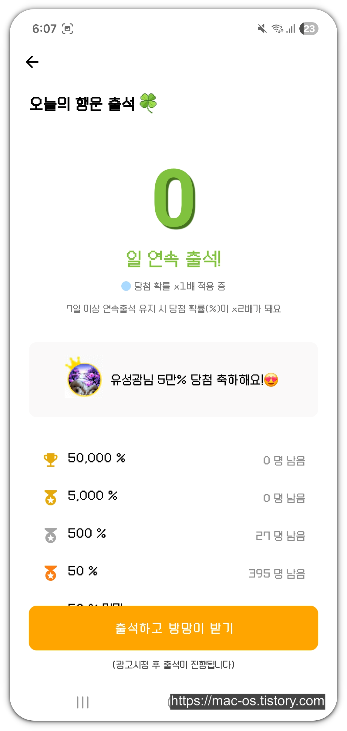 아래로 스크롤을 내려보면 출석체크가 있습니다. 출석 버튼을 눌러보니, 전면광고(5초 정도)가 나왔고, 광고를 닫으니까 50% 방망이를 받았습니다. 일정 확률로 높은 방망이를 주는 것 같습니다.