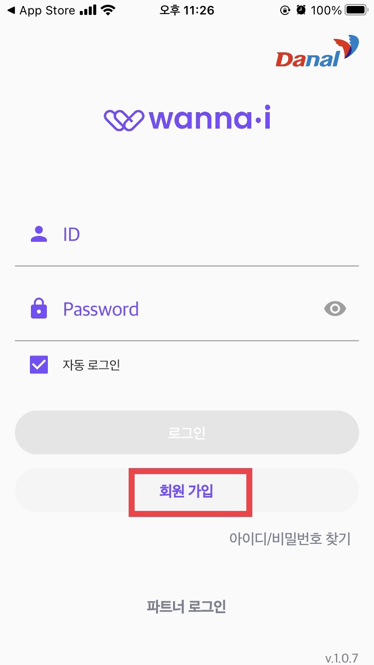 Google Play 혹은 App store에서 워너아이를 검색해 앱을 설치하실 수 있습니다. 앱을 실행하셔서 회원 가입을 누르시고, 아이디와 이름, 비밀번호를 입력해주세요.