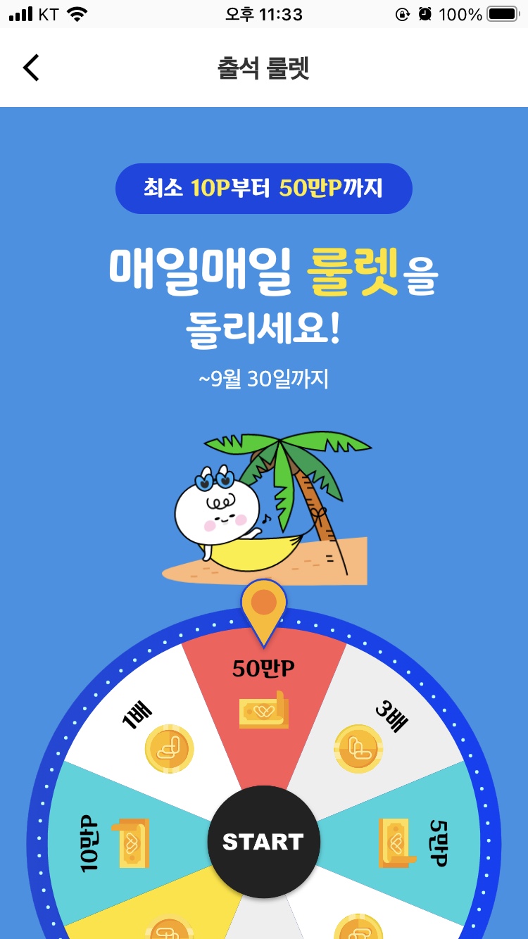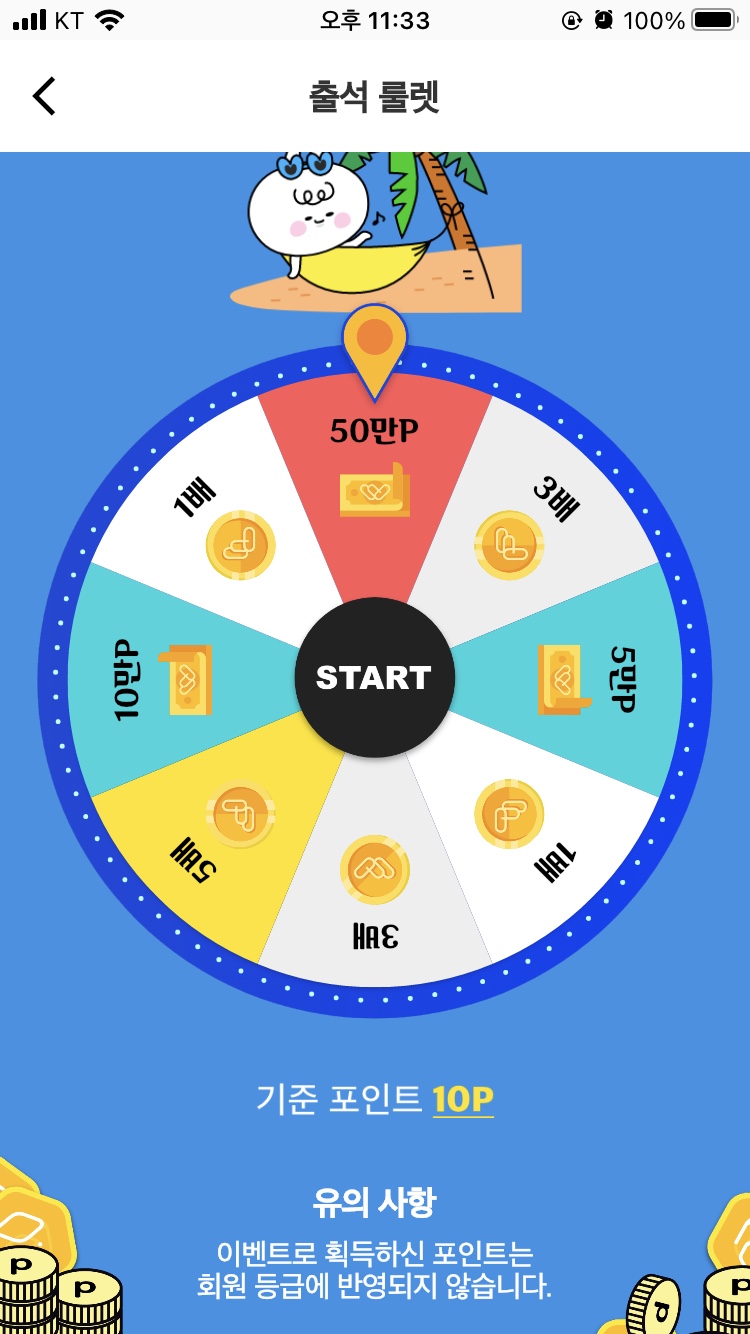 출석 룰렛은 최소 10P부터 최대 50만P까지 얻을 수 있는 이벤트입니다. 매일 자정이 되면 출석 횟수가 초기화됩니다. 기준 포인트는 10P로, 해당 룰렛에 보이는 1배, 3배, 5배는 10P, 30P, 50P에 해당합니다. 운이 좋으면 그보다 높은 5만P, 10만P, 50만P를 얻으실 수도 있습니다.