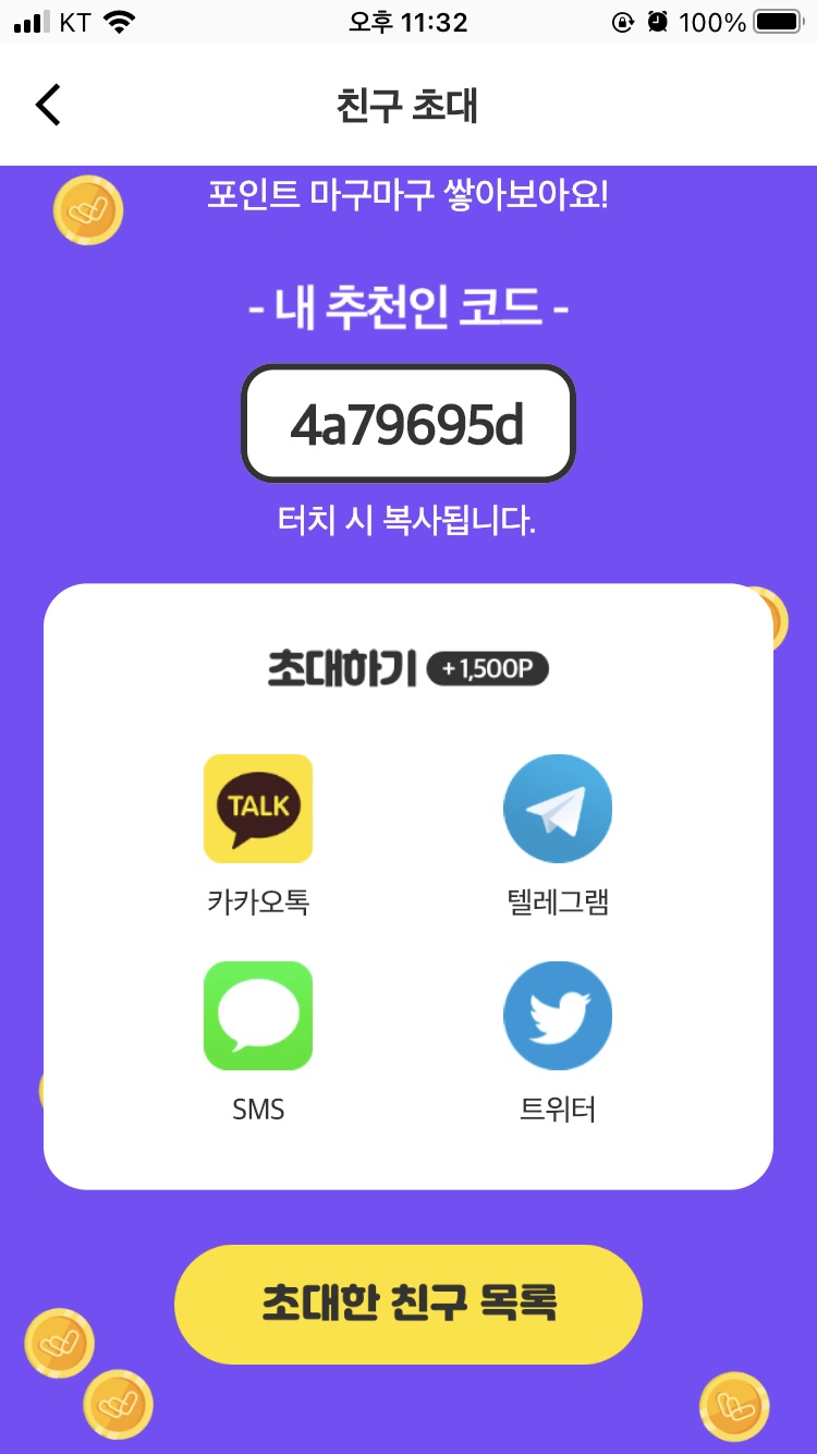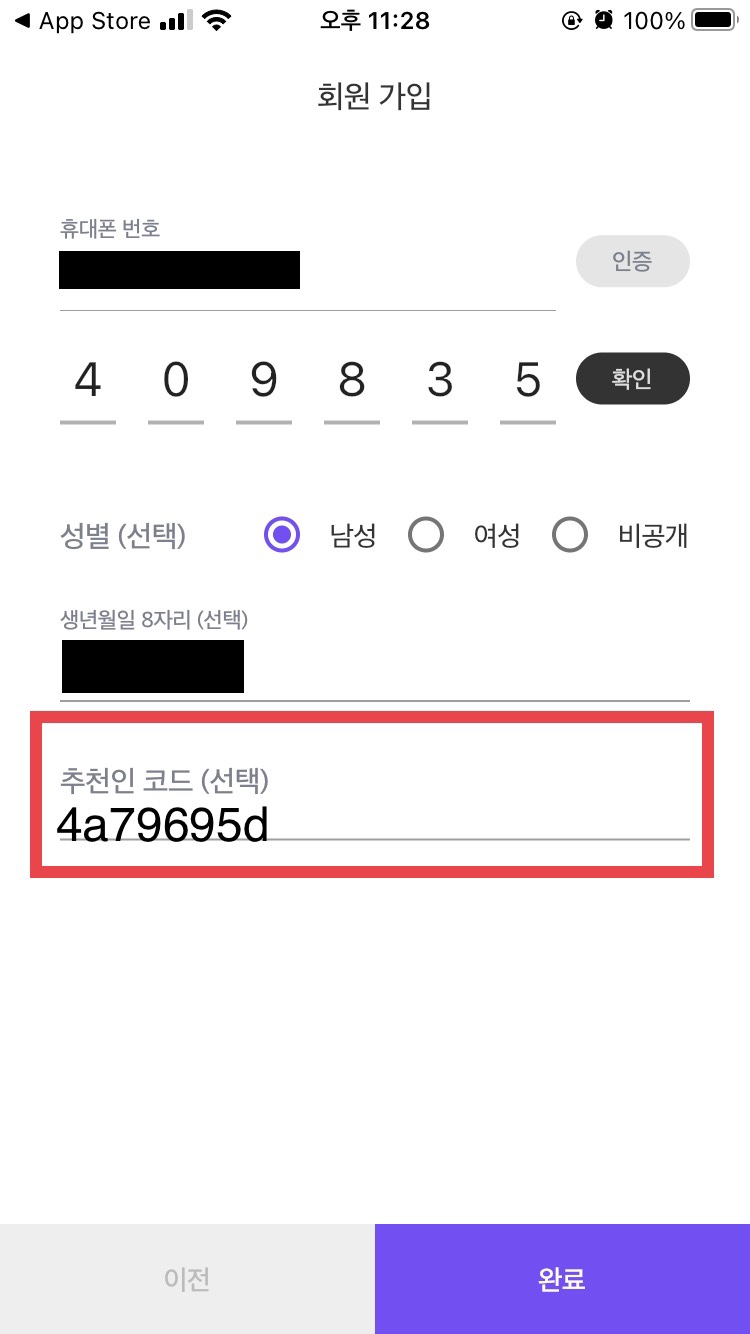 그리고 휴대폰 본인 인증을 진행해주세요. 그러면 아래에 추천인 코드(선택) 입력 란이 있습니다. 여기에 "4a79695d" 입력하시고 완료를 누르세요.