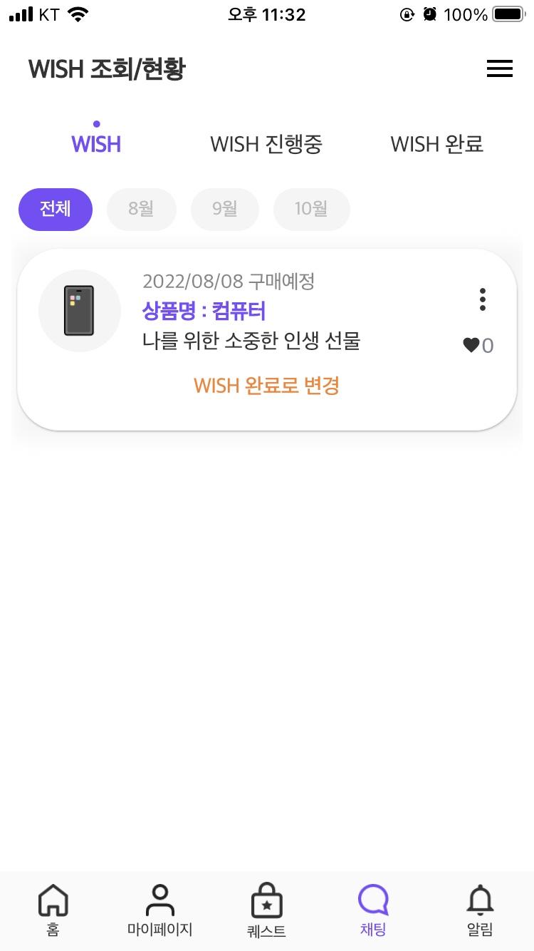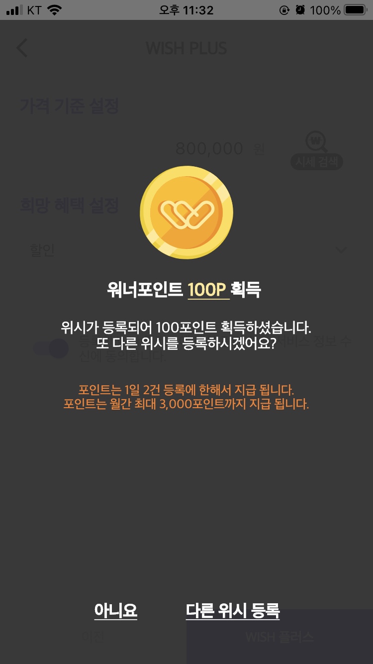 홈 화면에서 + 버튼을 누른 후, 그리고 WISH 플러스를 터치하면 버킷리스트를 등록하실 수 있습니다. 버킷리스트는 자신이 구매하고 싶은 물건의 상세 정보를 입력하기만 하면 되는 작업입니다. 버킷리스트는 하루에 최대 2번 등록할 수 있으며, 한달에 30회까지 등록할 수 있습니다.