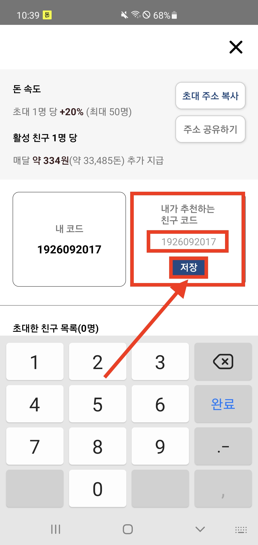 친구를 초대하면 돈이 적립되는 속도가 빨라지게 된다. 한명 초대할 때마다 20%가 늘어나는데 입력할 친구코드가 없다면 1926092017을 복사하여 붙여넣기해서 입력하면 된다.