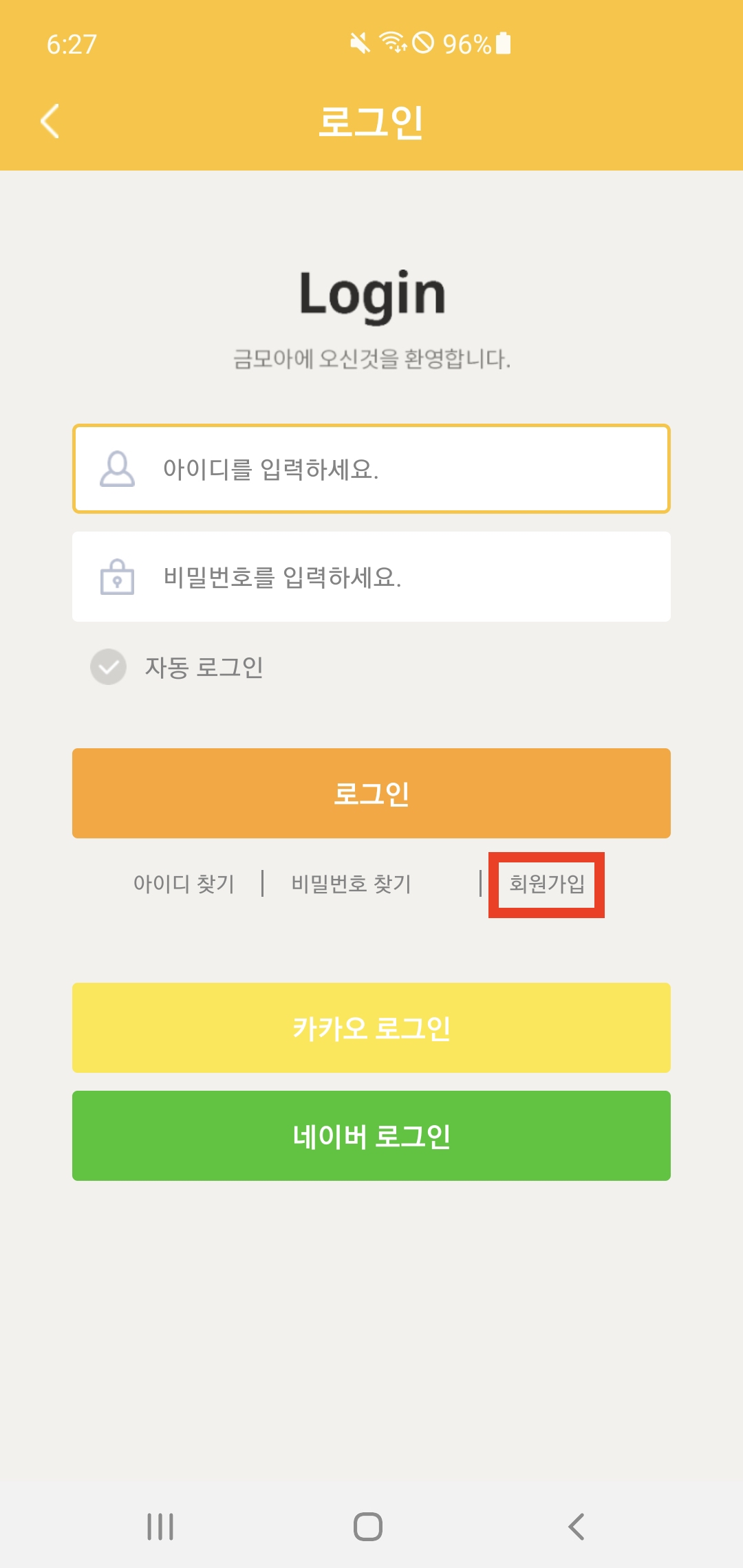 회원가입을 눌러 휴대폰 인증을 선택한다.