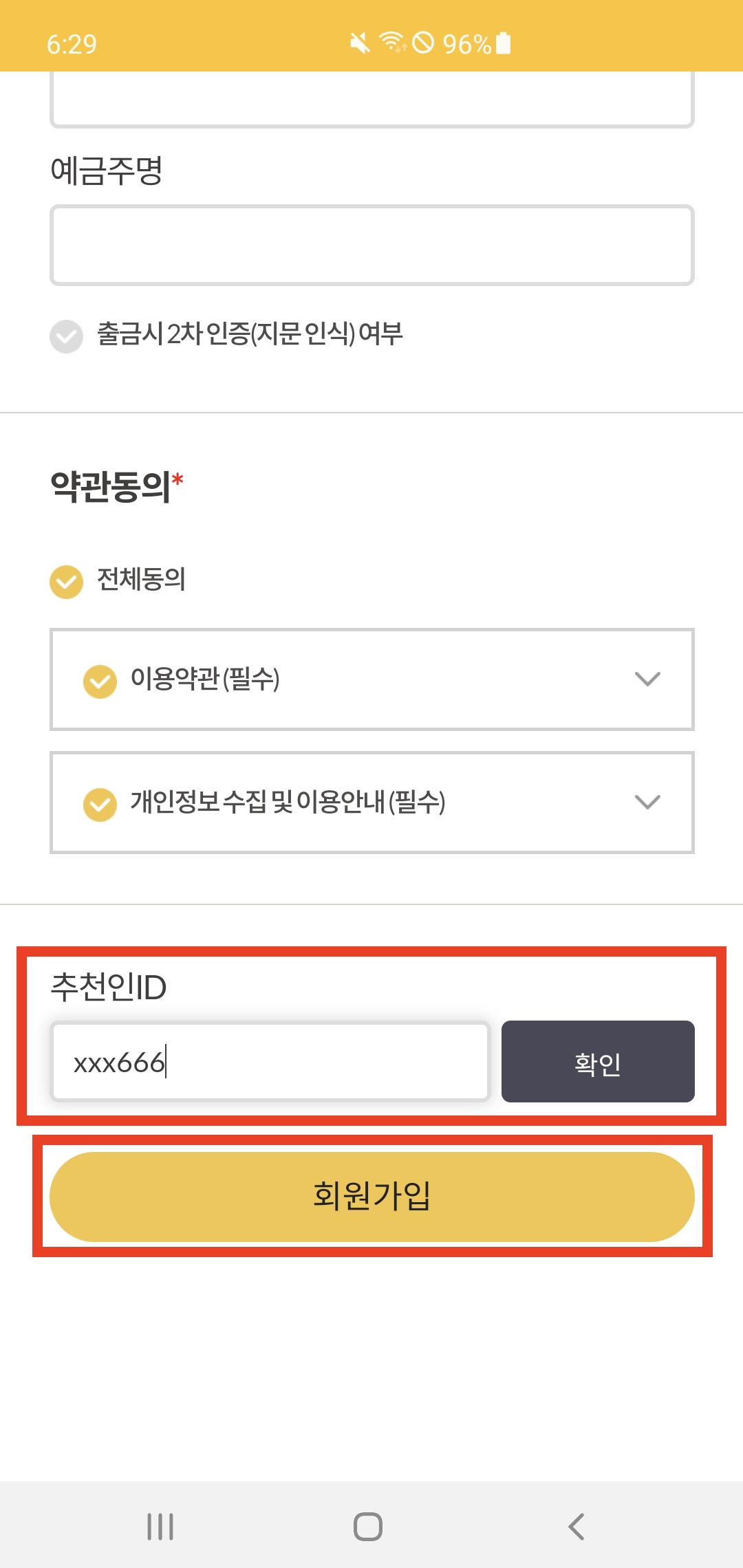 금모아 앱을 설치하고 처음 실행하면 회원가입을 진행하게 된다. 가입 페이지에서 추천인ID를 입력할 수 있는데 여기에 xxx666를 입력하면 2,000포인트를 받을 수 있다.