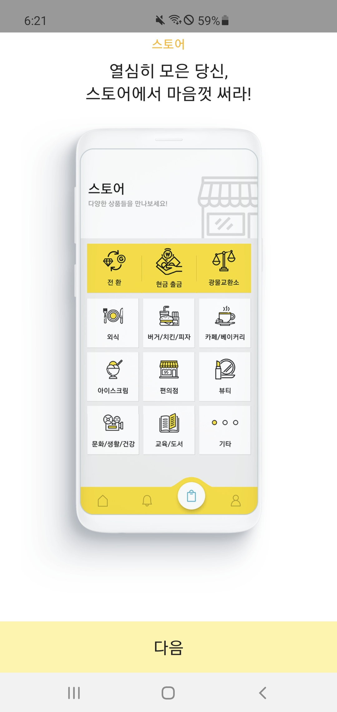 이렇게 앱에서 받은 광물과 골드, 다이아는 스토어에서 광물교환소를 이용해 골드를 다이아로 전환할 수 있다. 그 외에 현금 출금, 외식, 버거/치킨/피자, 카페/베이커리, 아이스크림, 편의점, 뷰티, 문화/생활/건강 등 다양한 기프티콘 구매가 가능하다.