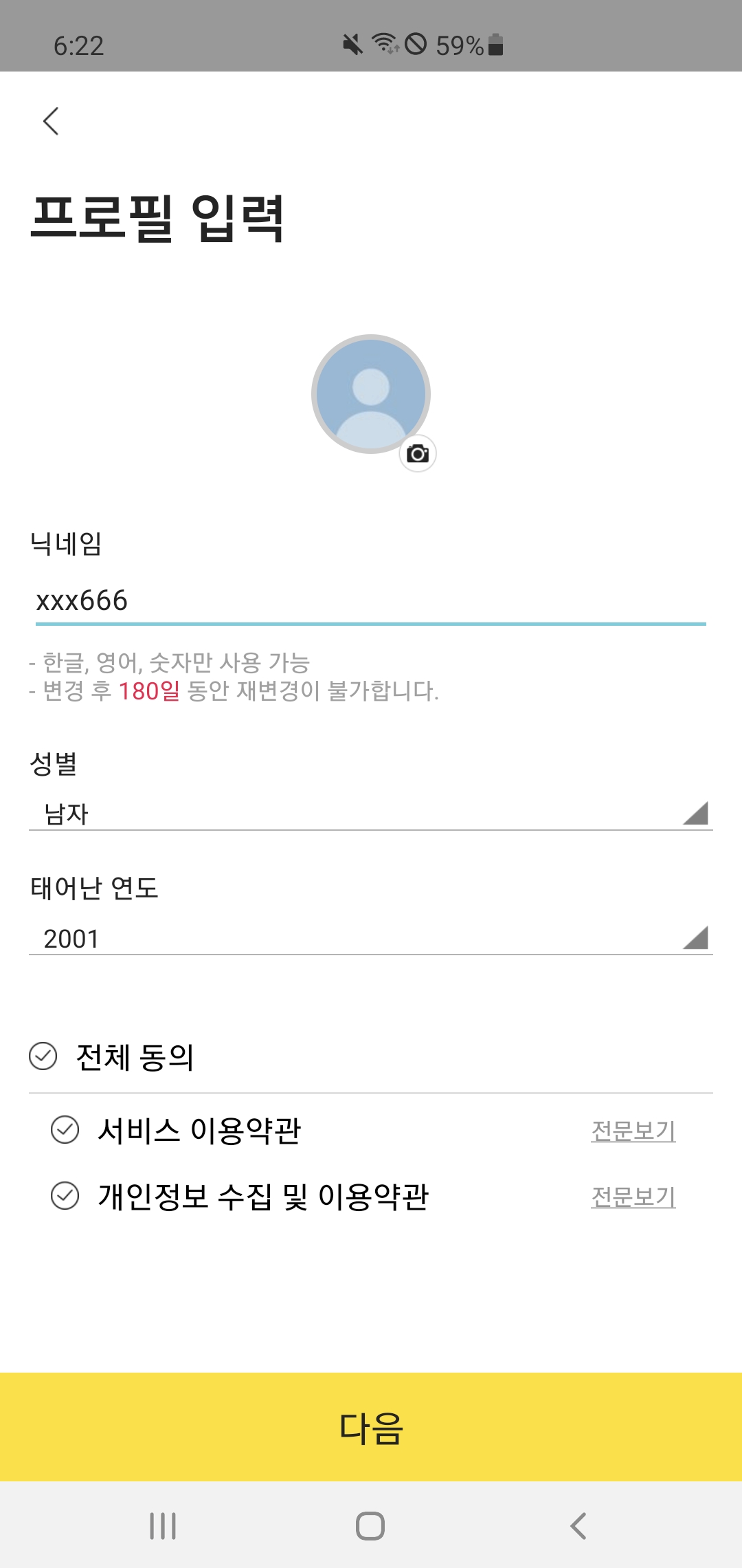 프로필 입력페이지에서 닉네임과 성별, 태어난 연도를 입력하면 추천코드 입력 페이지로 이동한다.