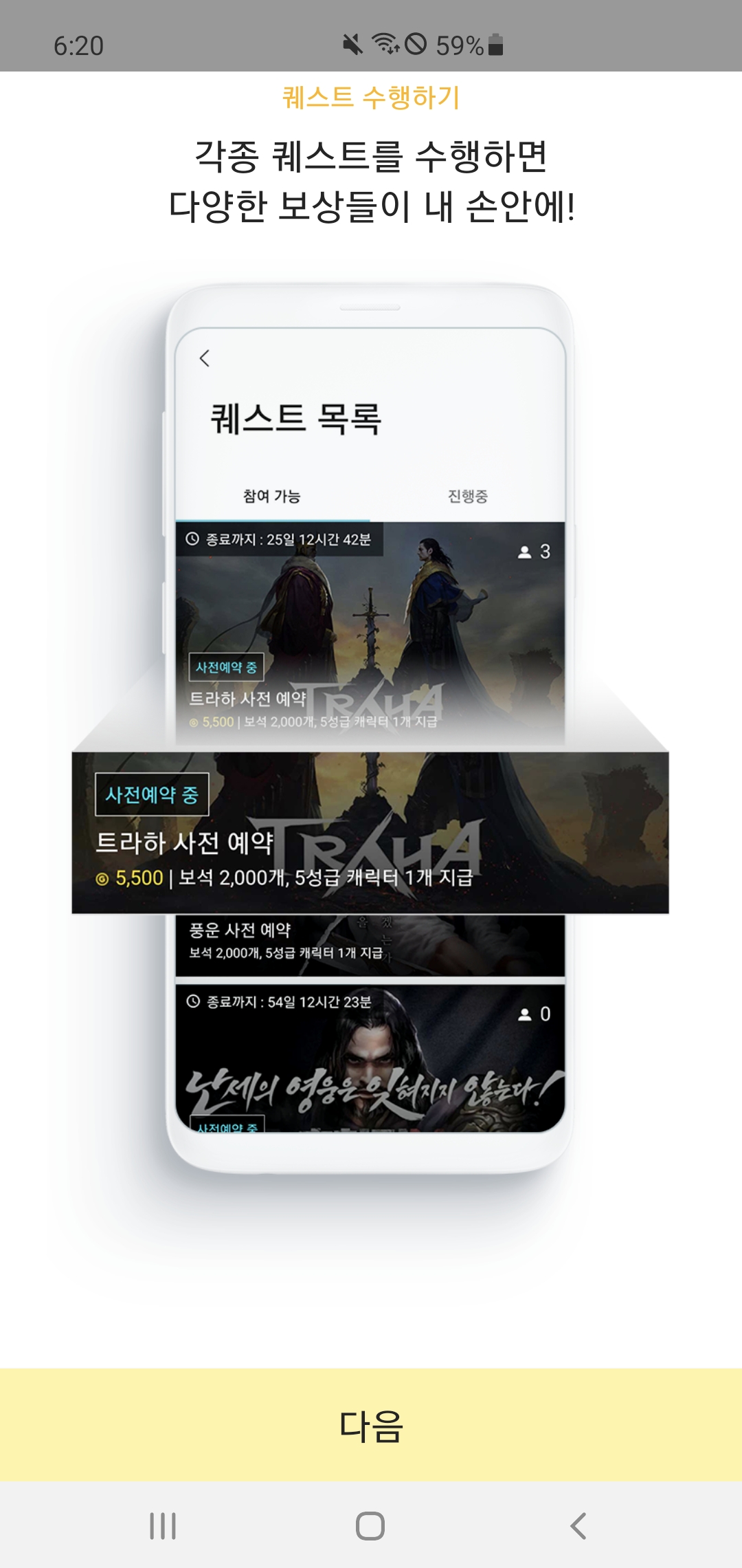 앱을 처음 실행하면 퀘스트마인 이용 가이드 슬라이드 이미지가 등장하는데 하단의 다음을 눌러 넘겨주면 된다.