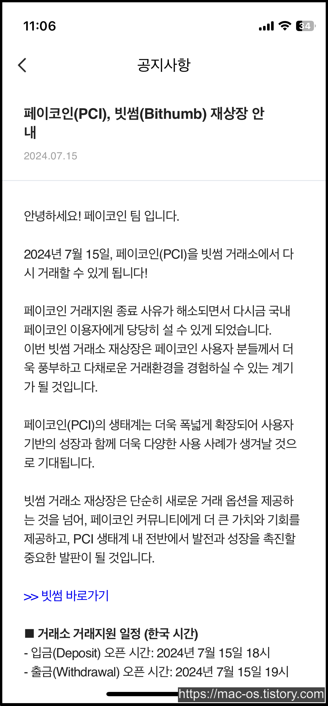 7월 15일에 페이코인이 빗썸에 재상장되었고