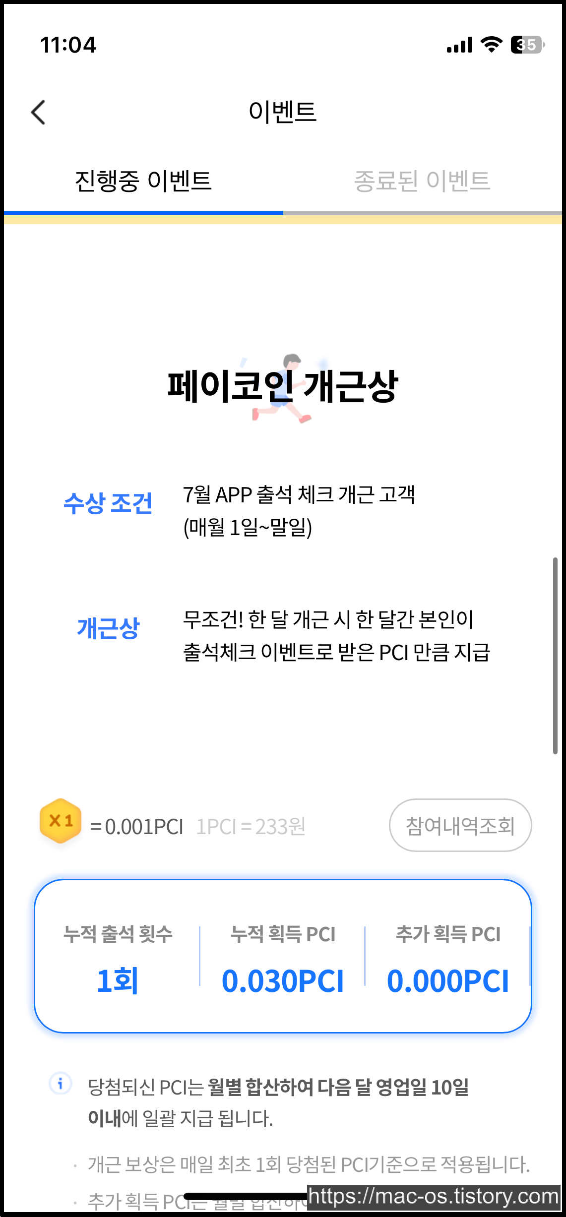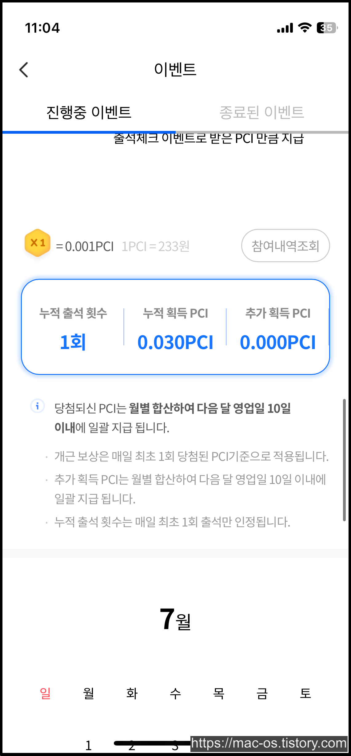 한 달 개근 시 한 달간 본인이 출석체크로 받은 PCI만큼