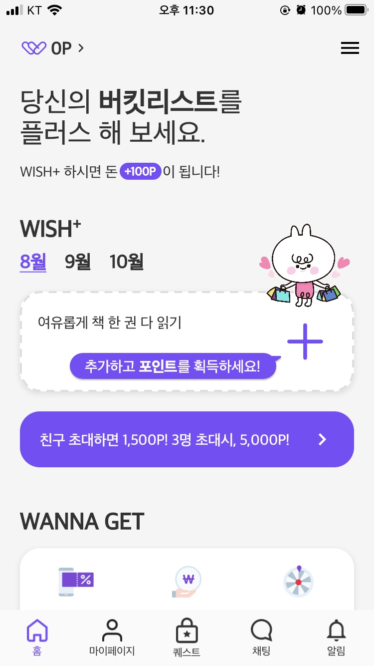 버킷리스트를 1회 작성할 때마다 100 워너포인트가 적립되므로, 하루에 200P, 한달에 최대 3,000P까지 적립이 가능합니다. 그리고 자신이 등록한 WISH를 조회하거나 현황을 확인하실 수도 있습니다. 홈 화면에서 모바일 상품권과 캐시백, 출석 룰렛이라는 기능을 확인하실 수 있는데 차례대로 살펴보도록 하겠습니다.