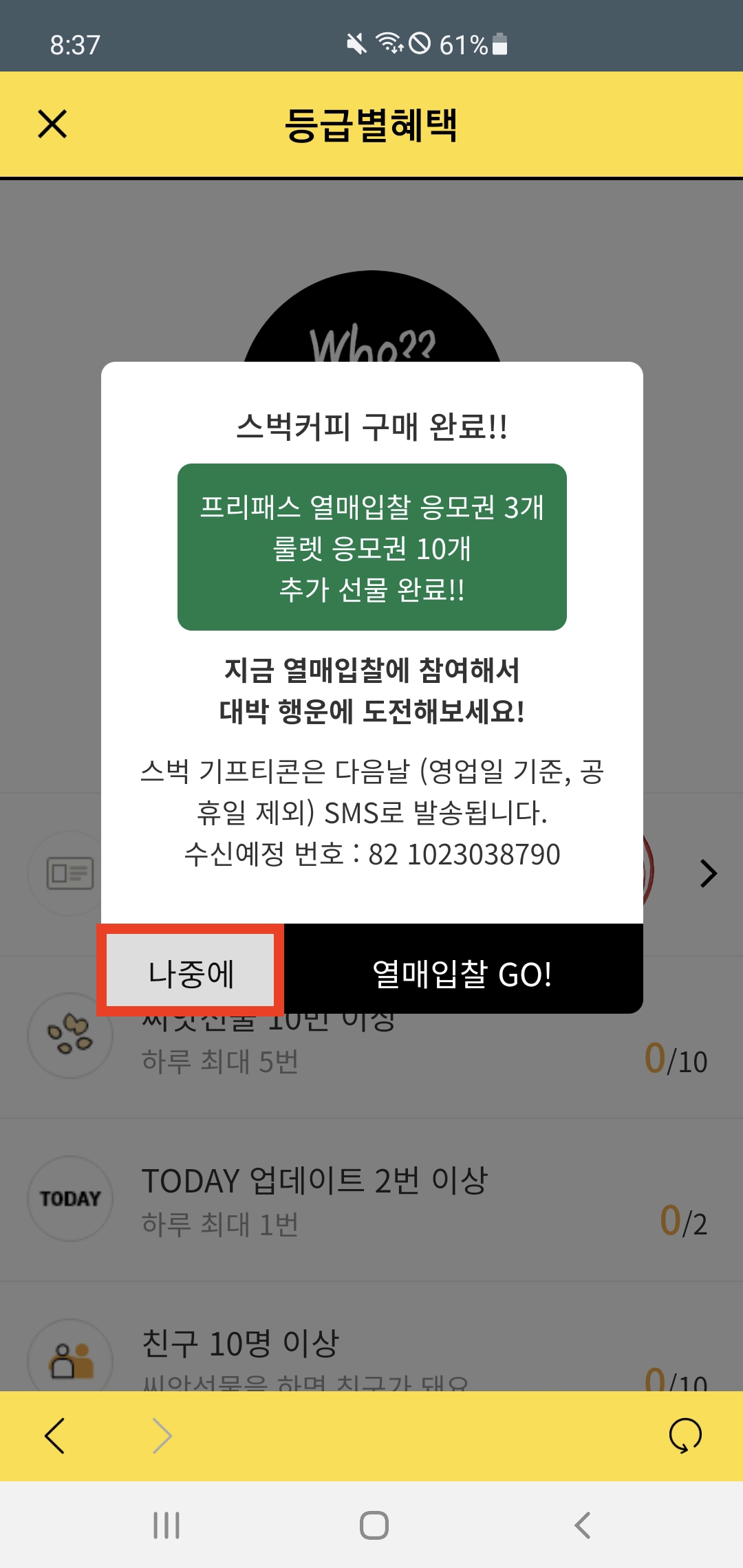 라. 혜택 : 스타벅스 아메리카노 커피 1잔 기프티쇼 쿠폰 지급