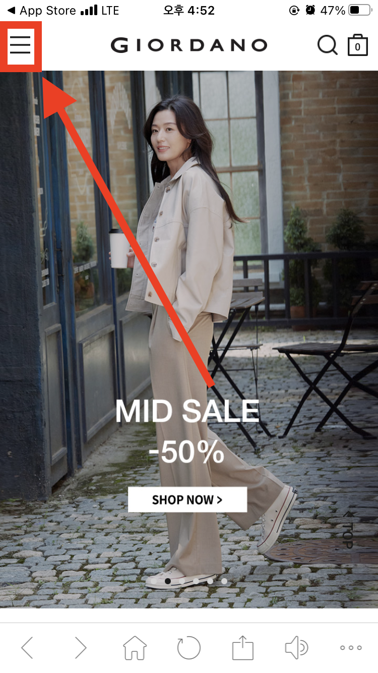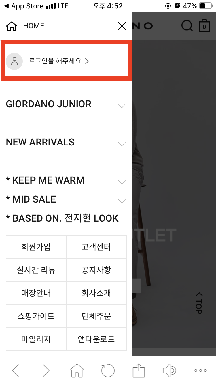 지오다노 앱을 설치하고 실행한 다음, 좌측 상단 더보기 메뉴를 통해 로그인 페이지로 이동한다.