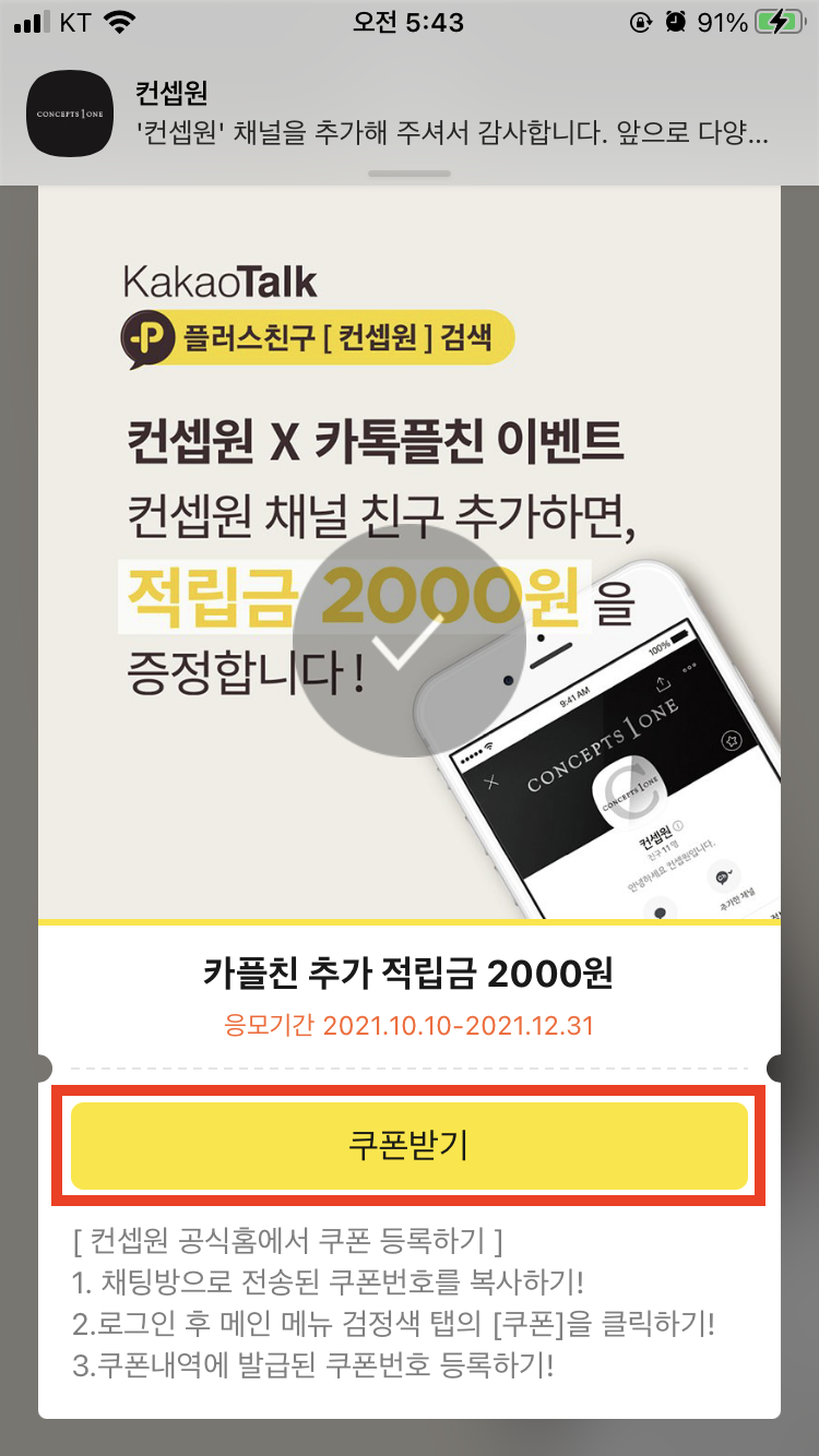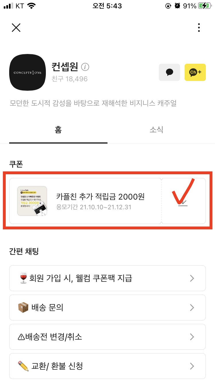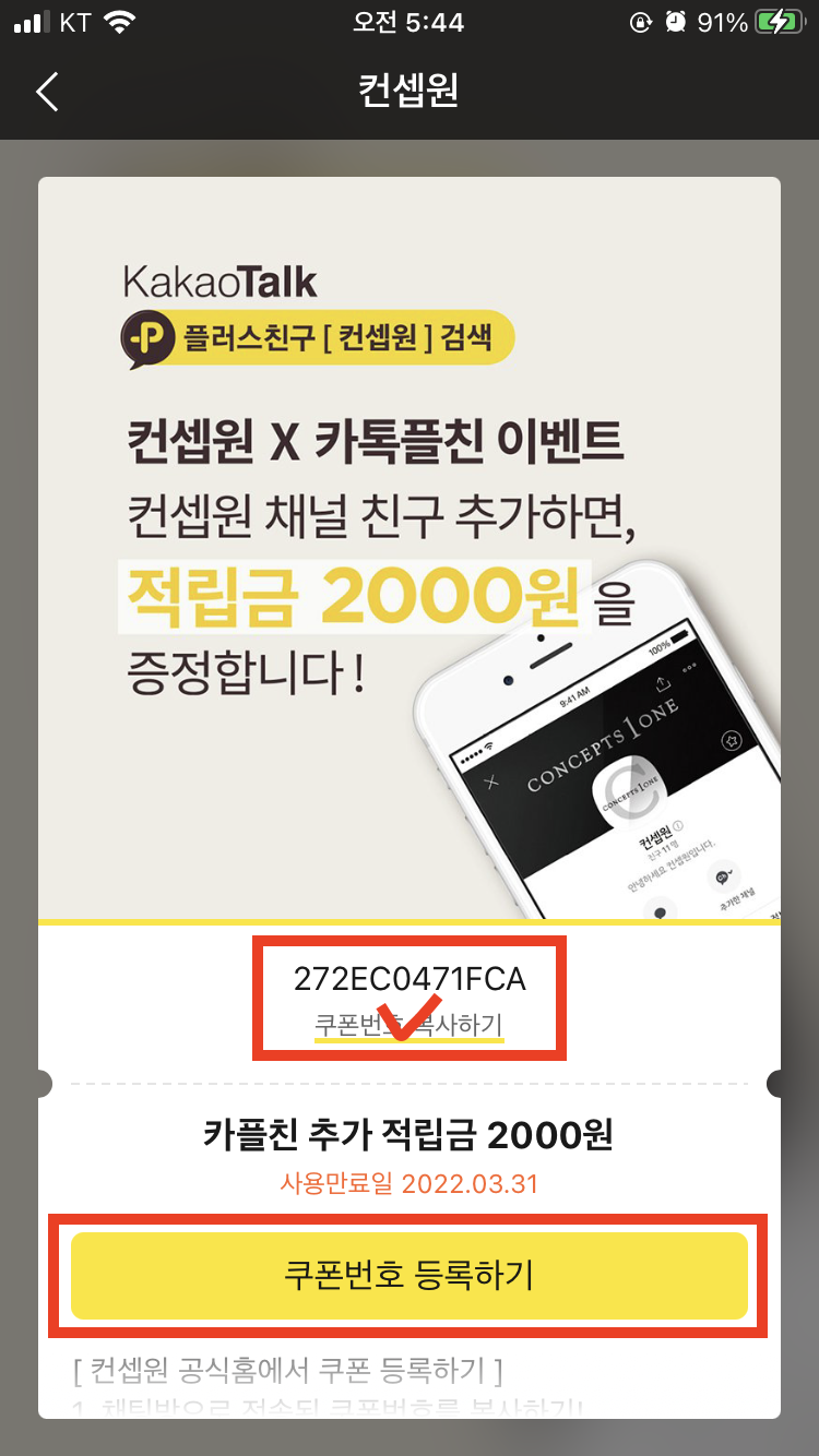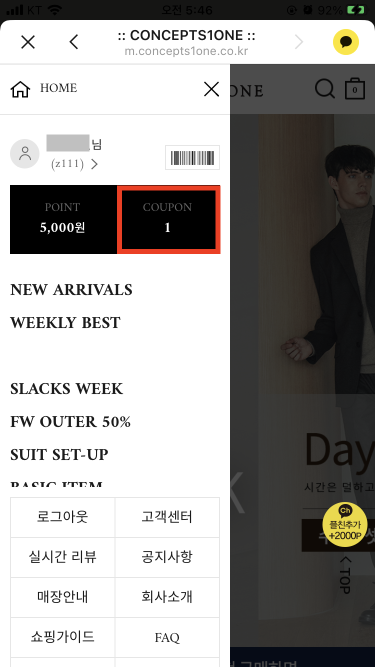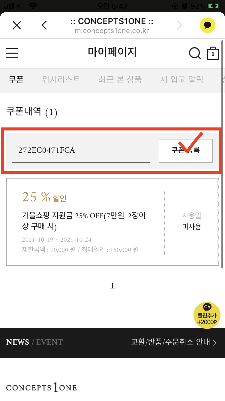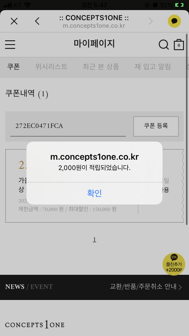 채널추가 후 증정된 적립금 2,000원 쿠폰 번호를 복사하고, 컨셉원 웹사이트로 이동한다.