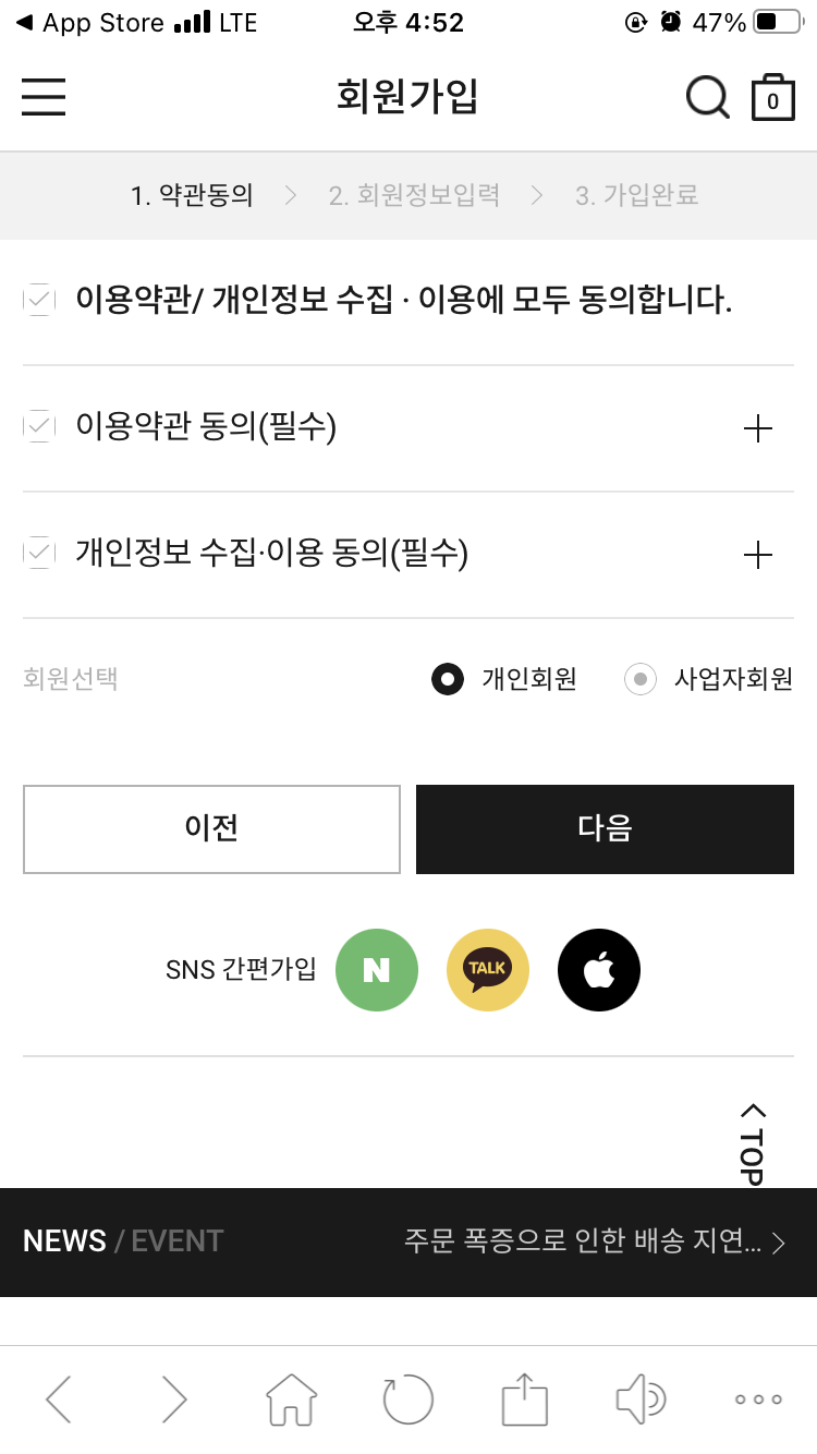로그인 페이지에서 '회원가입'을 터치해 가입을 진행하면 된다.