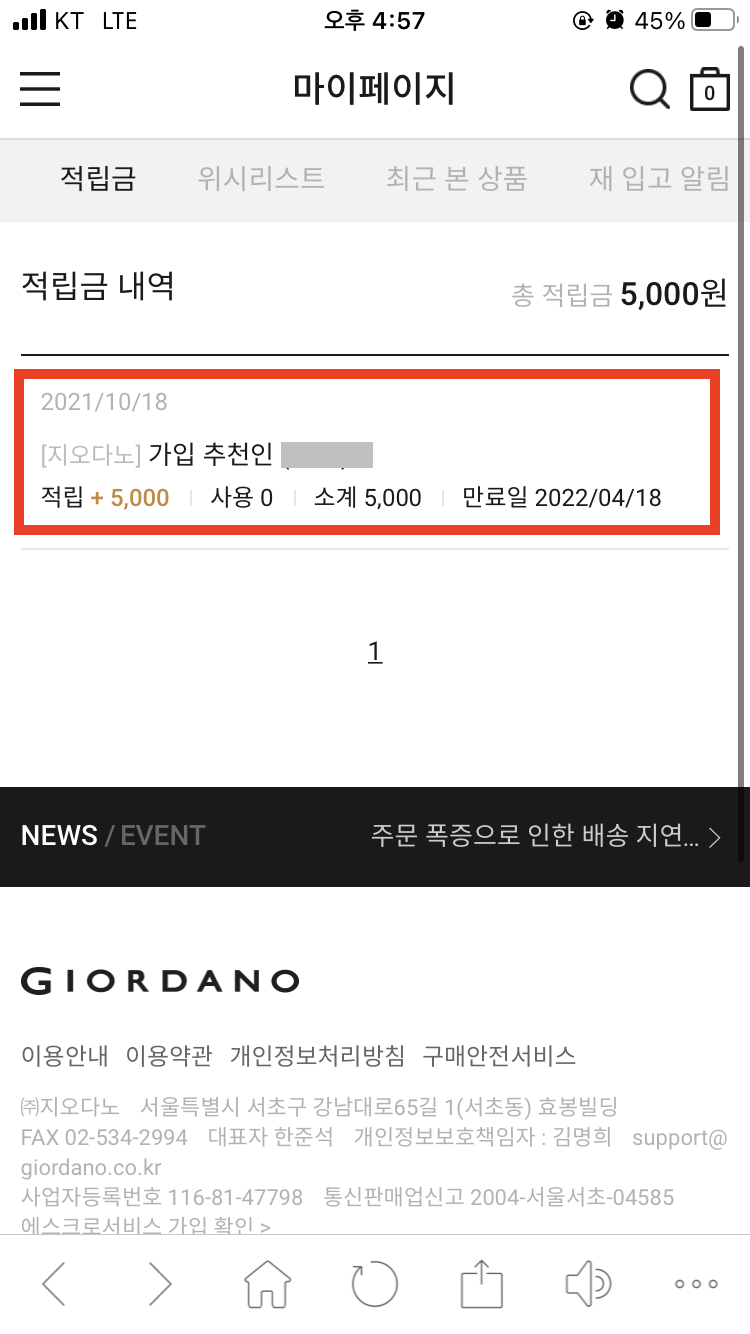"지오다노 추천인 아이디 입력 방법/적립금 5천원 받는 법"