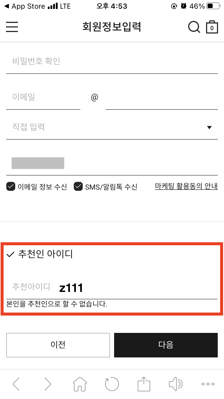 추천인 아이디는 z111을 입력하면 되고, 여기서 SMS/알림톡 수신을 체크해야 현재 진행중인 친구초대 이벤트에 참여할 수 있다.