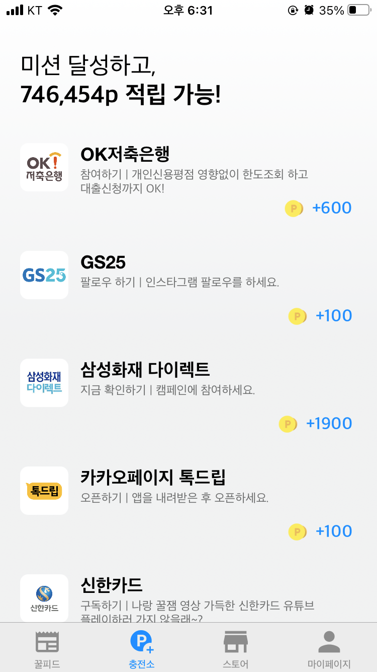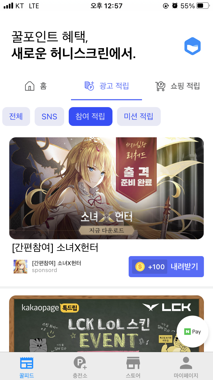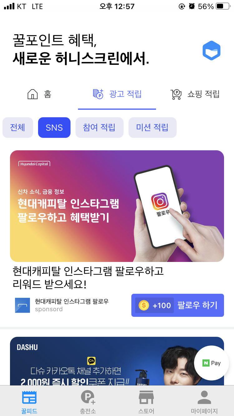 허니스크린 충전소 메뉴입니다. 충전소 탭에서는 직관적으로 광고를 보여주기 때문에 보다 쉽게 참여할 수 있다는 장점이 있습니다. SNS와 참여 적립, 미션 적립들의 광고가 한 곳에 있어서 적립하기 편합니다.