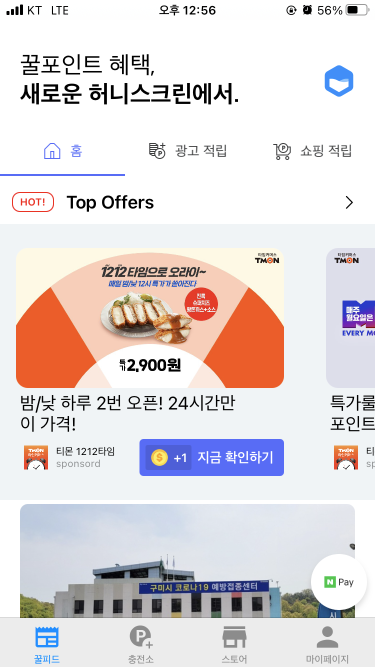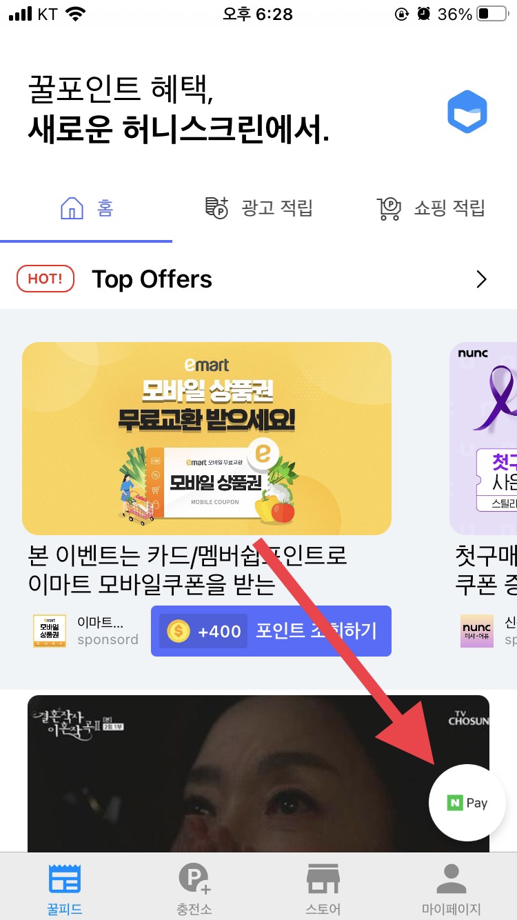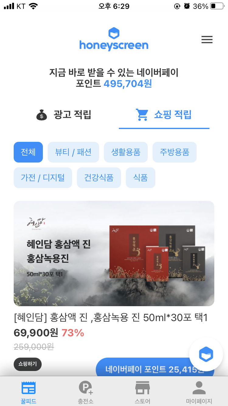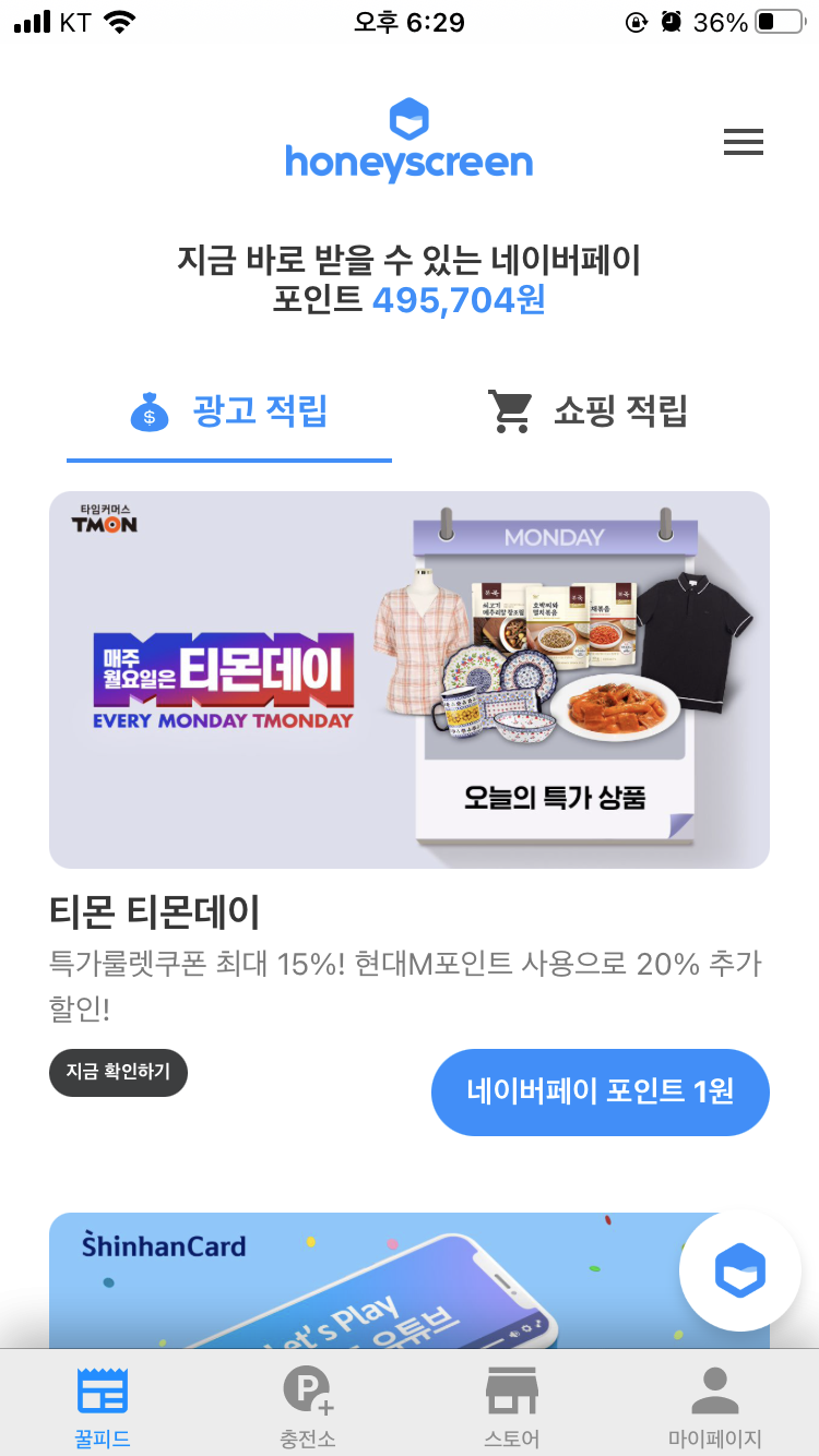 오른쪽 아래에 보이는 네이버페이 모양 버튼을 터치하게 되면, 허니스크린 포인트 적립에서 네이버페이 포인트 적립으로 변경됩니다. 변경 후 광고 적립과 쇼핑 적립을 통해 네이버페이 포인트를 얻을 수 있게 됩니다. 쇼핑 적립은 특정 상품 구매 시 일정 비율만큼 포인트를 지급하는 리워드입니다. 그러나 직접 자신의 돈으로 결제를 해야한다는 점이 단점입니다.
