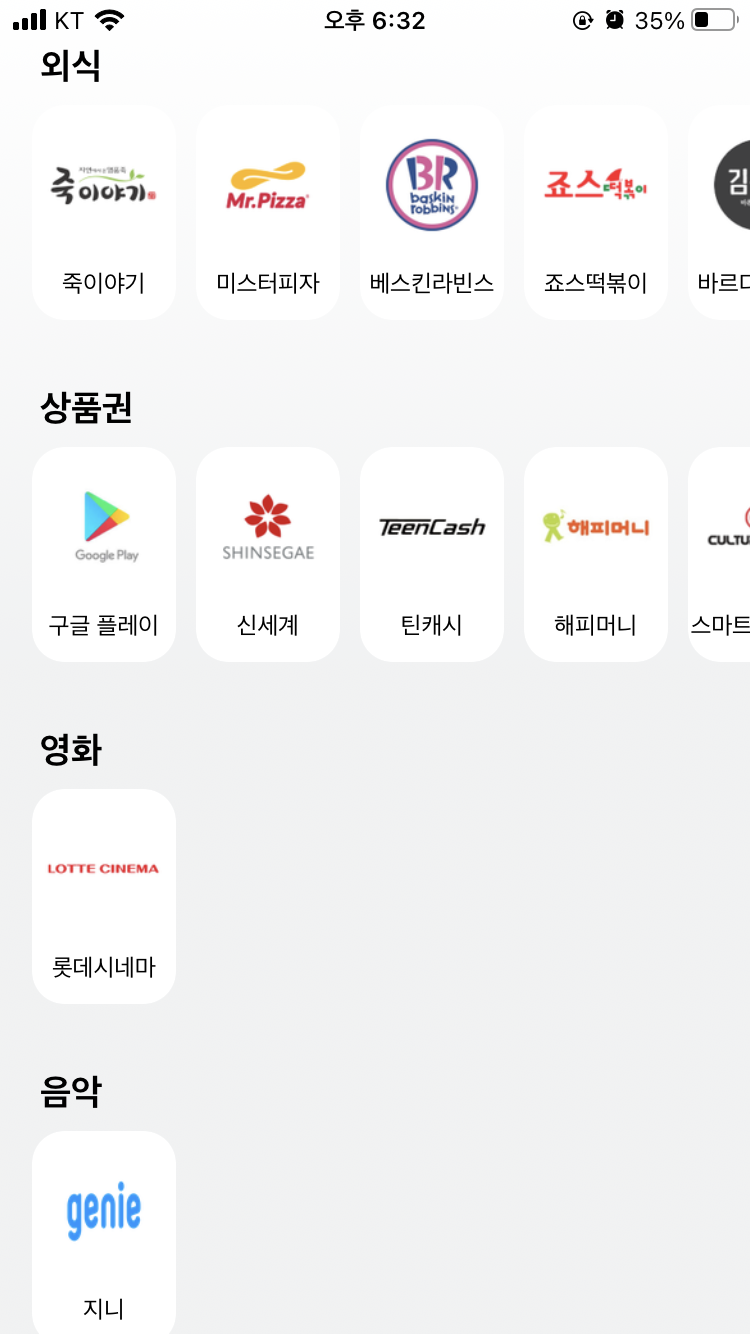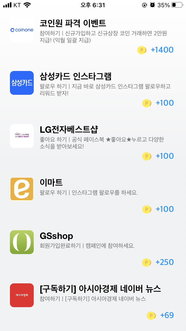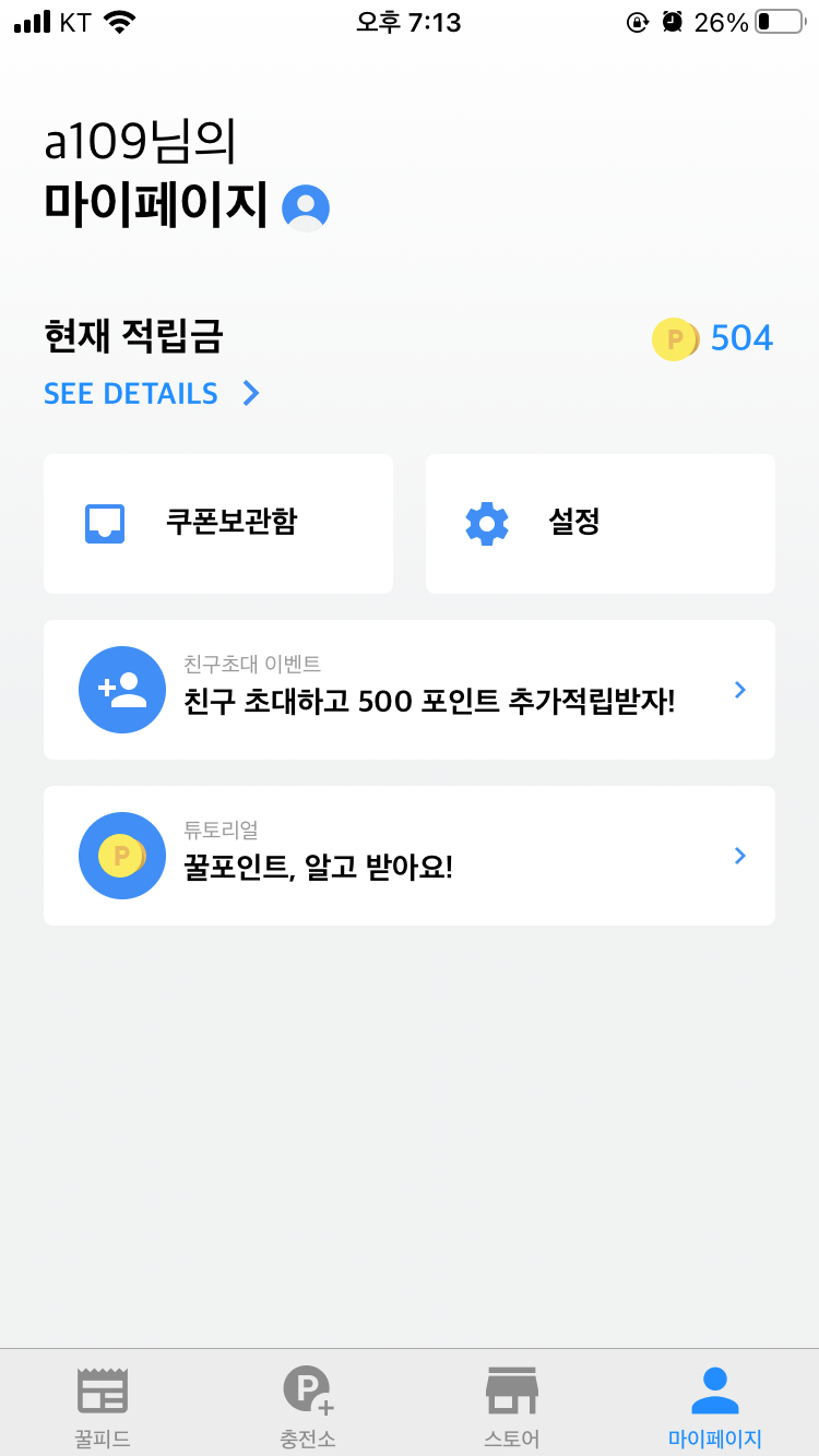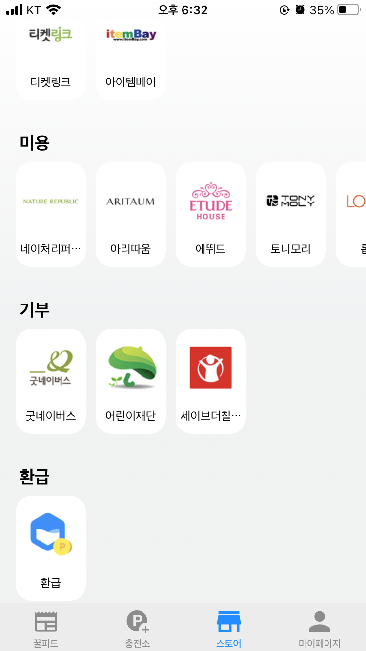 스토어에서 다양한 제휴 기프티콘을 구매하실 수 있습니다. 그 이외에 스크롤을 아래로 내리시면 있는 환급을 통해 포인트를 현금으로 전환하실 수도 있습니다. 현재 친구초대 이벤트를 진행하고 있어 신규유저가 회원가입할 때, 추천인 아이디를 입력하게 되면 서로 500원을 지급합니다.