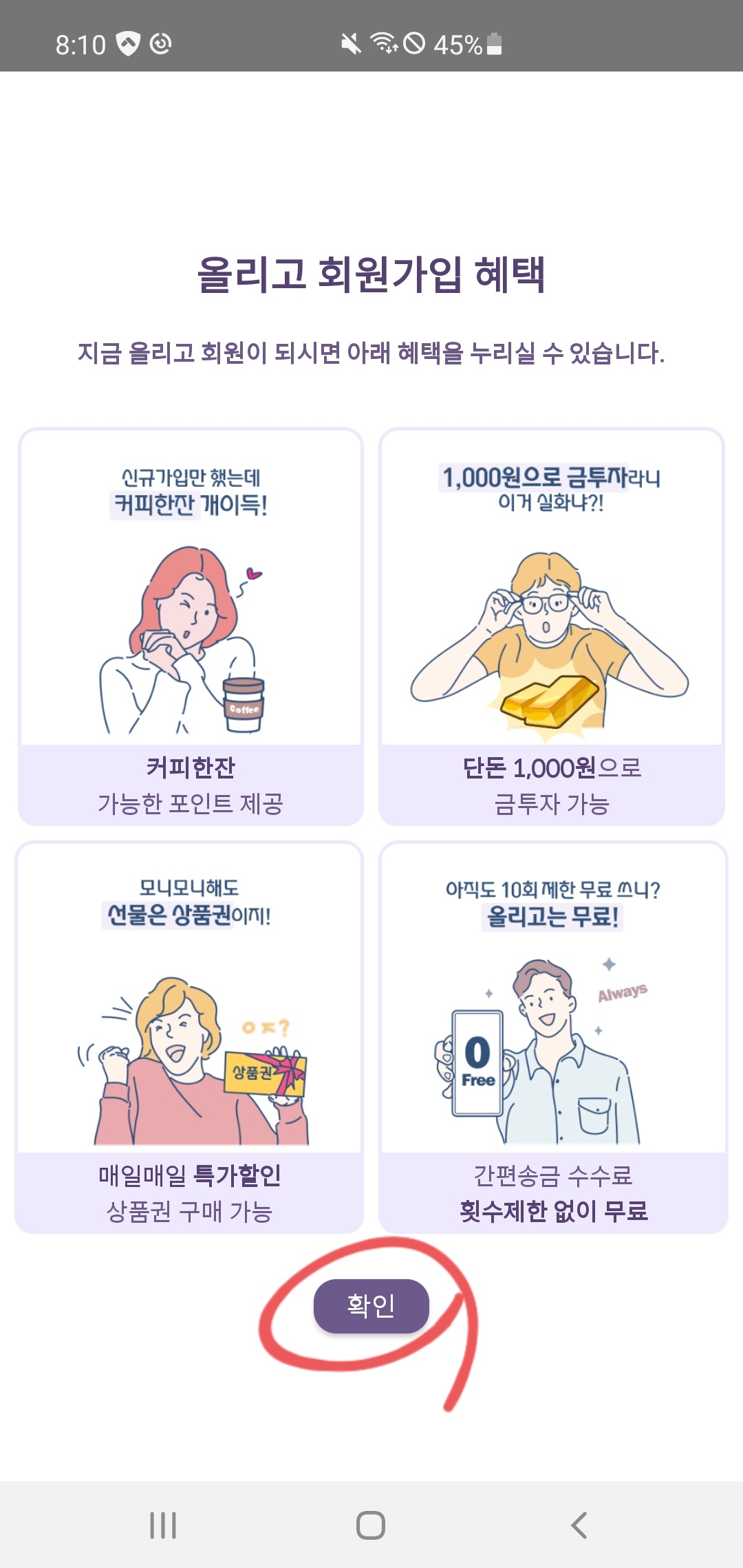 처음 앱을 실행하면 올리고 회원가입 혜택 안내 창이 등장하는데 '확인'을 눌러주자.