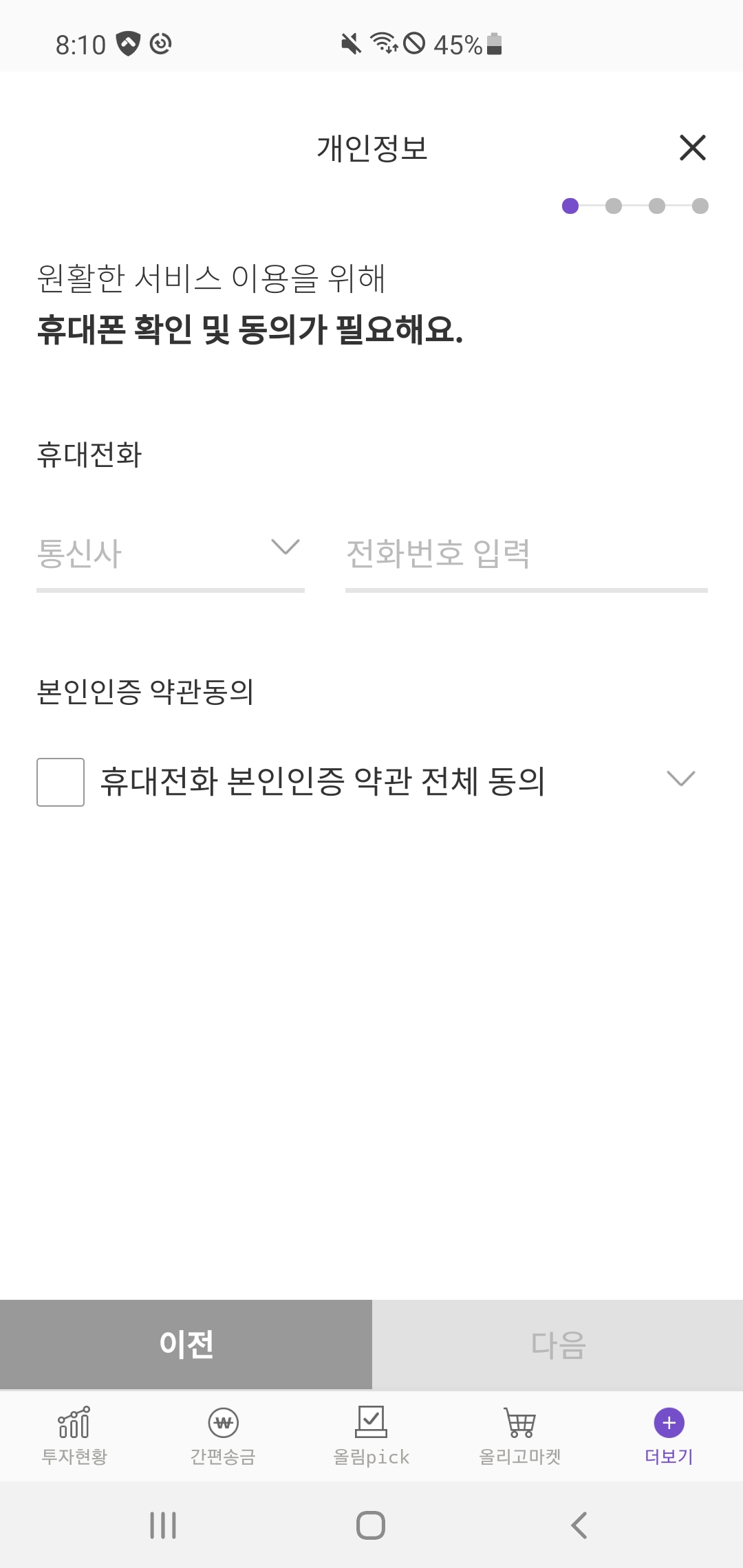 그리고 다음 페이지에서 휴대전화 번호 입력, 계좌 연결을 진행해 준다. (여기서 계좌를 입력하면 2,000P가 지급된다.)