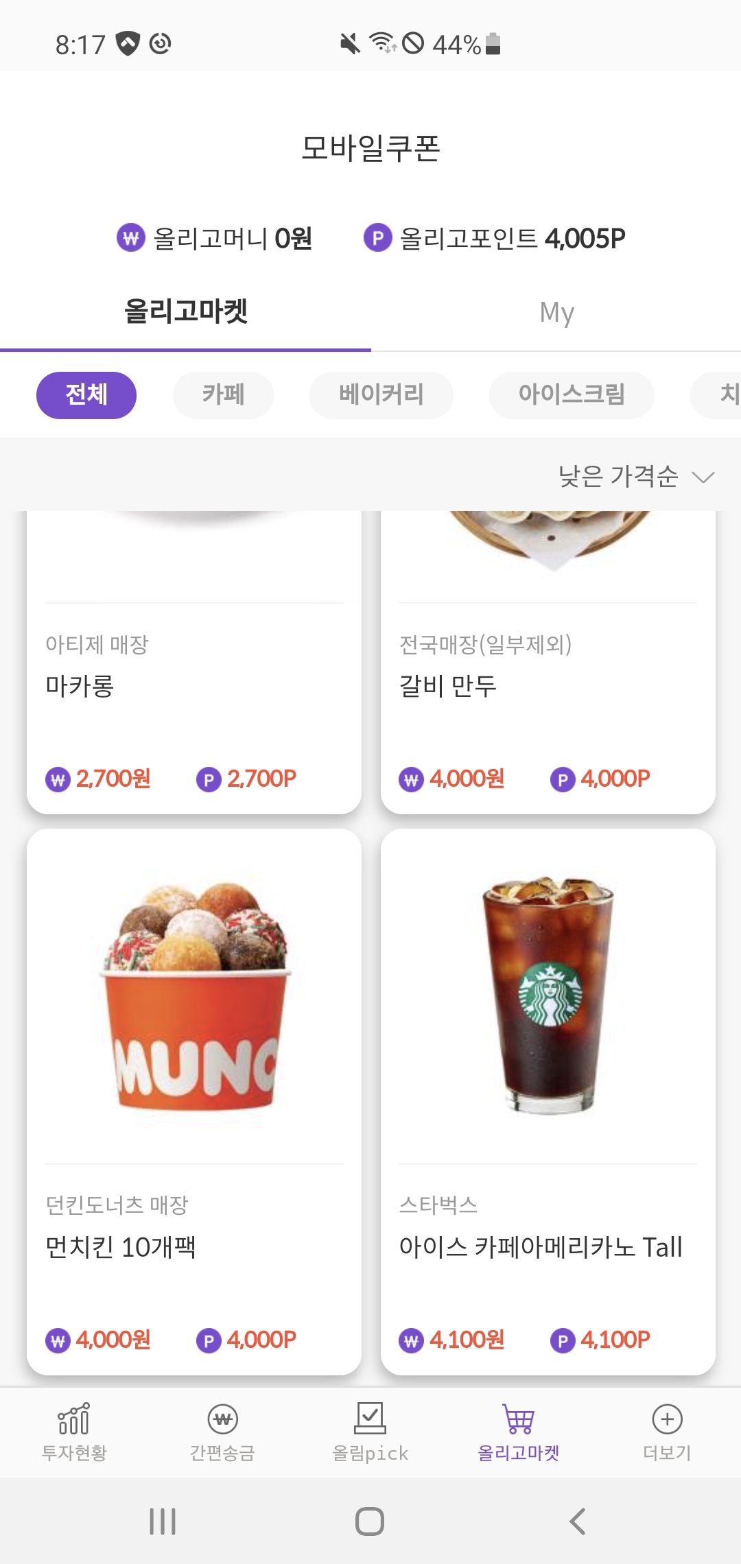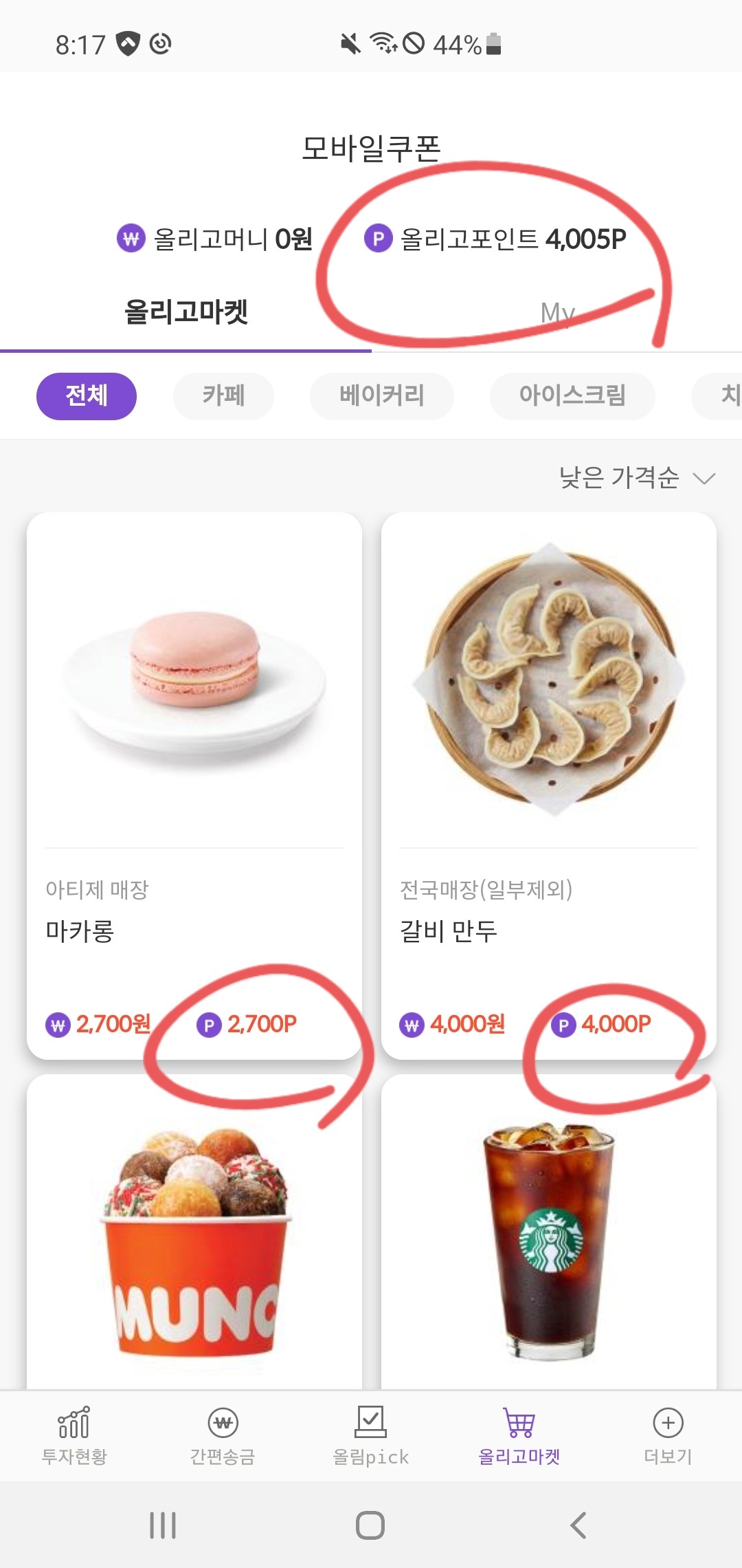 스타벅스 아메리카노 쿠폰은 4,100원이라 100원을 추가로 결제해야 하지만, 던킨도너츠 먼치킨같은 경우 정확하게 4,000원이므로 올리고 포인트로 전액 결제가 가능하다. 쉽게 말해서, 올리고에 가입만 해도 던킨도너츠 먼치킨 쿠폰을 받을 수 있다는 이야기가 되겠다.