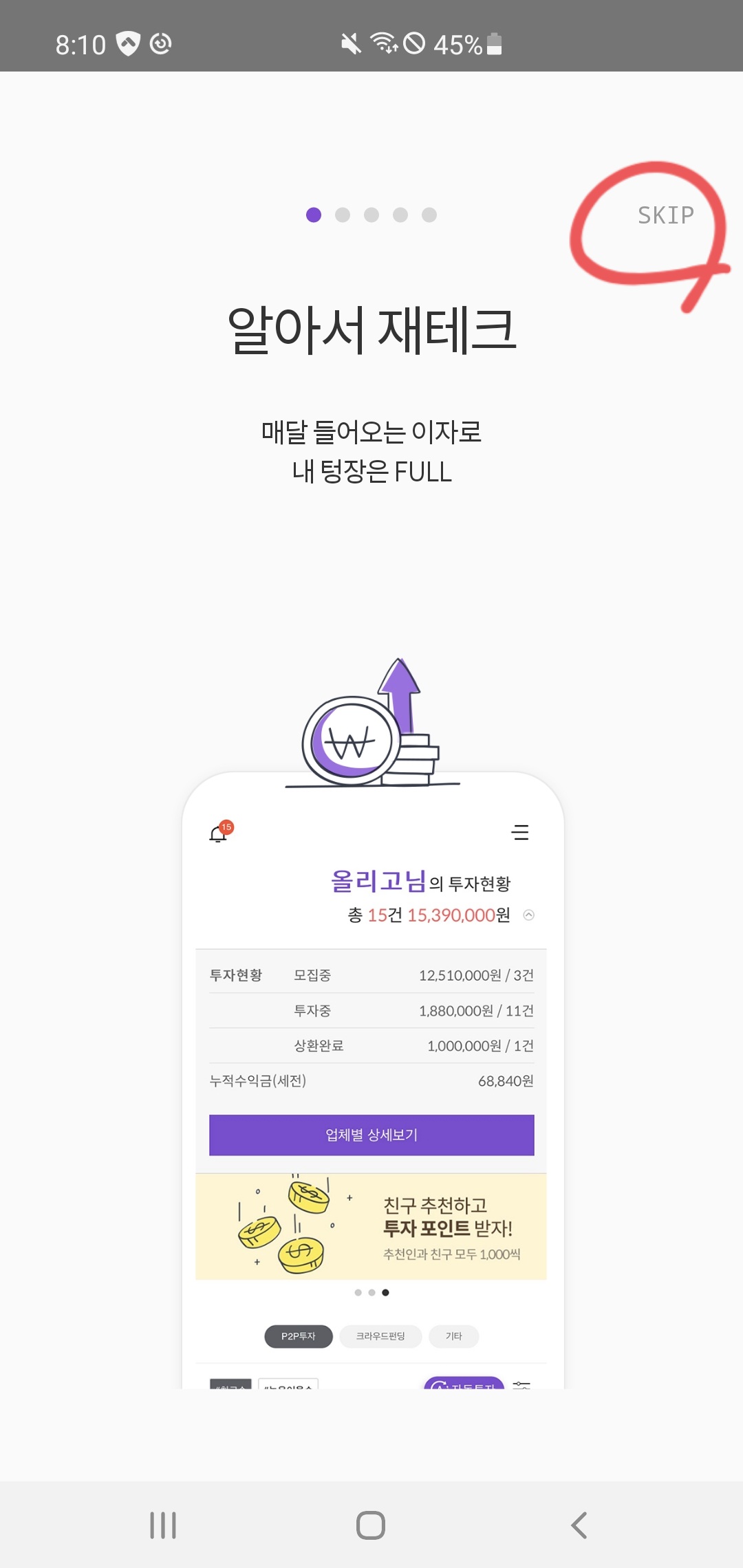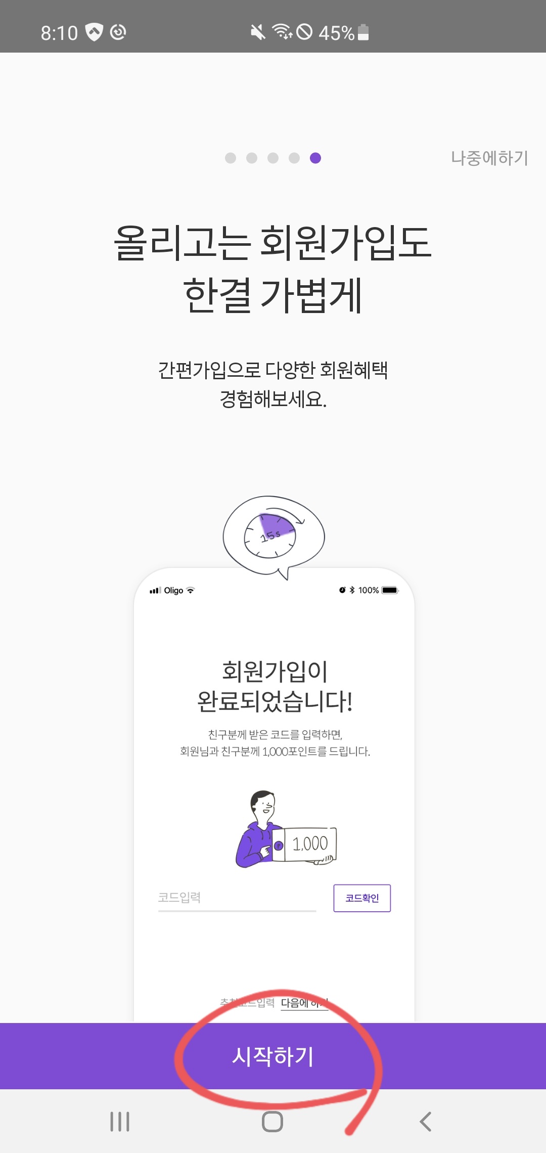 올리고 앱을 소개하는 슬라이드 이미지 5장이 등장하는데, 우측 상단 SKIP을 누르거나, 마지막 슬라이드에서 '시작하기'를 누르면 된다.