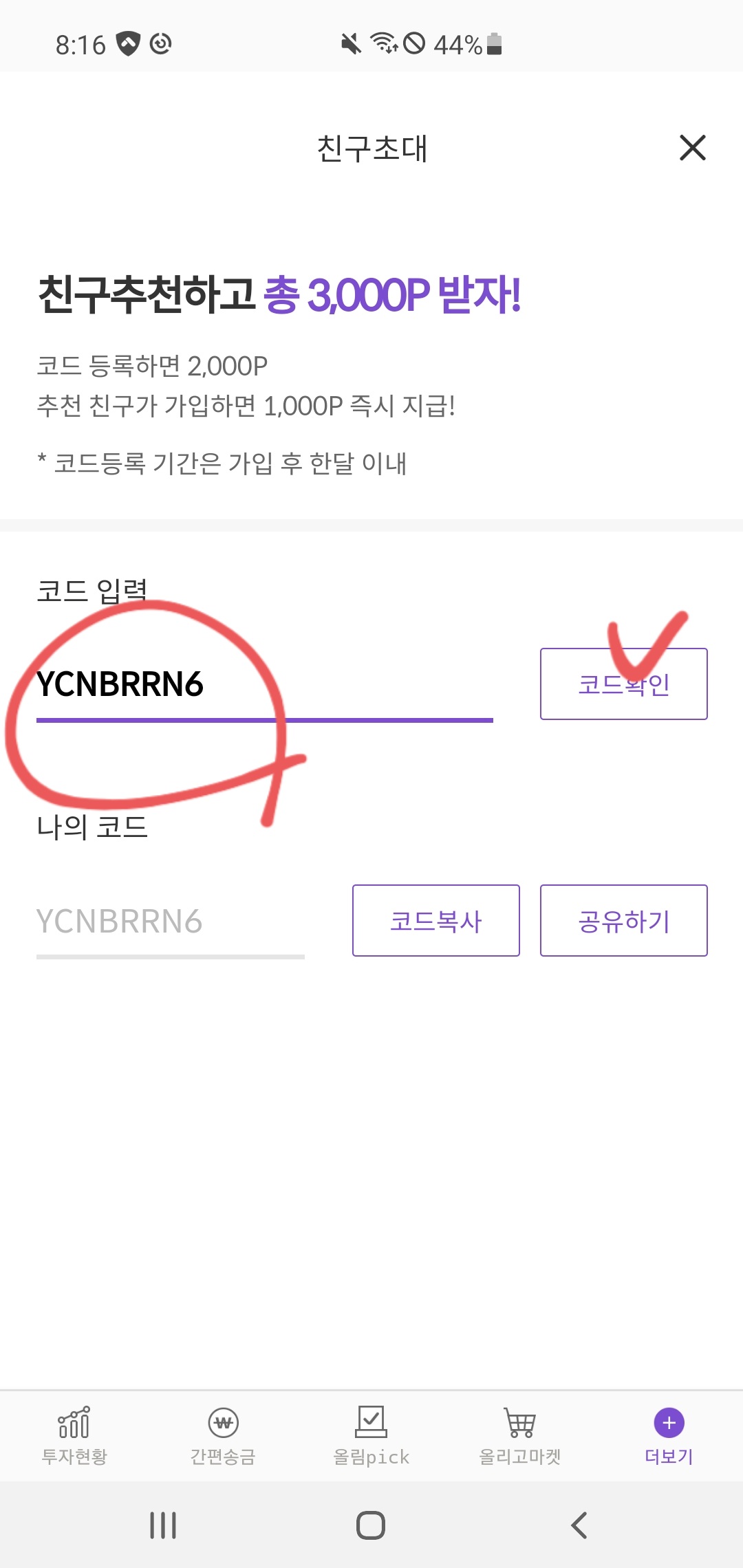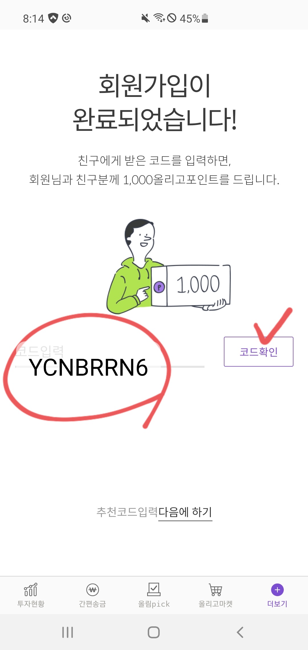 가입이 완료되면 추천인 코드를 입력하는 창이 뜨게 되는데, 여기서 YCNBRRN6을 복사/붙여넣기하고 '코드확인'을 눌러주면 2,000P가 지급된다.
