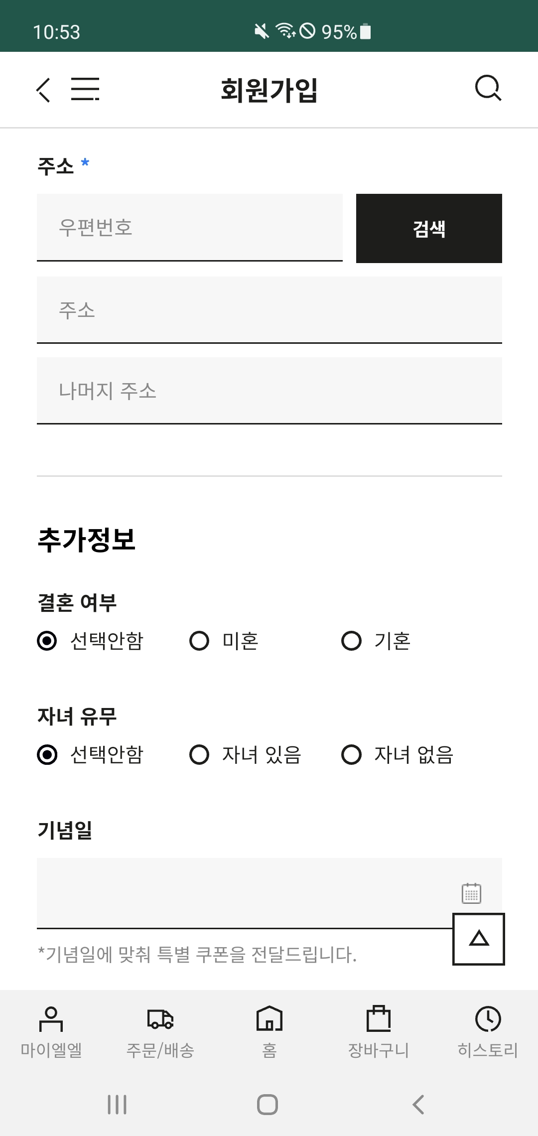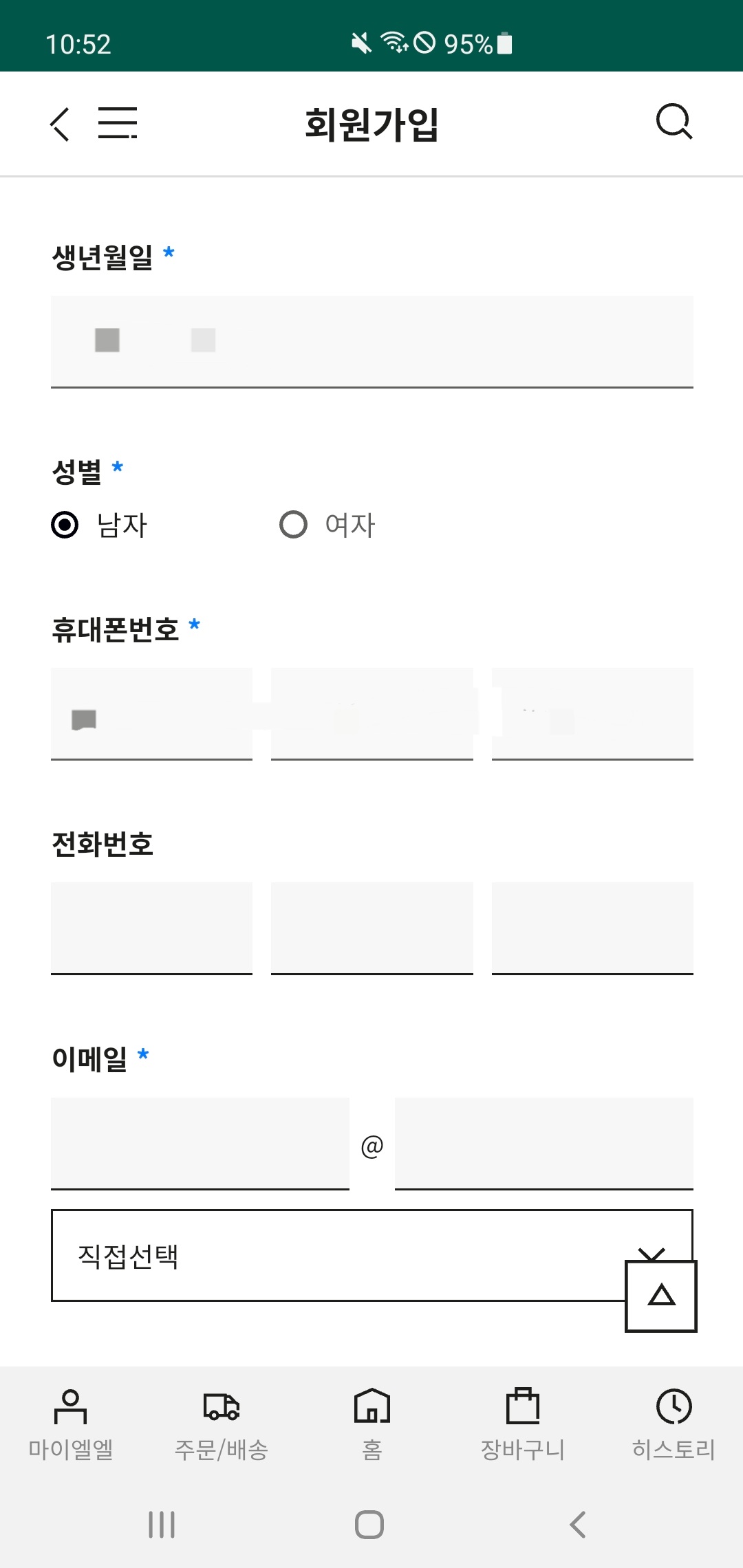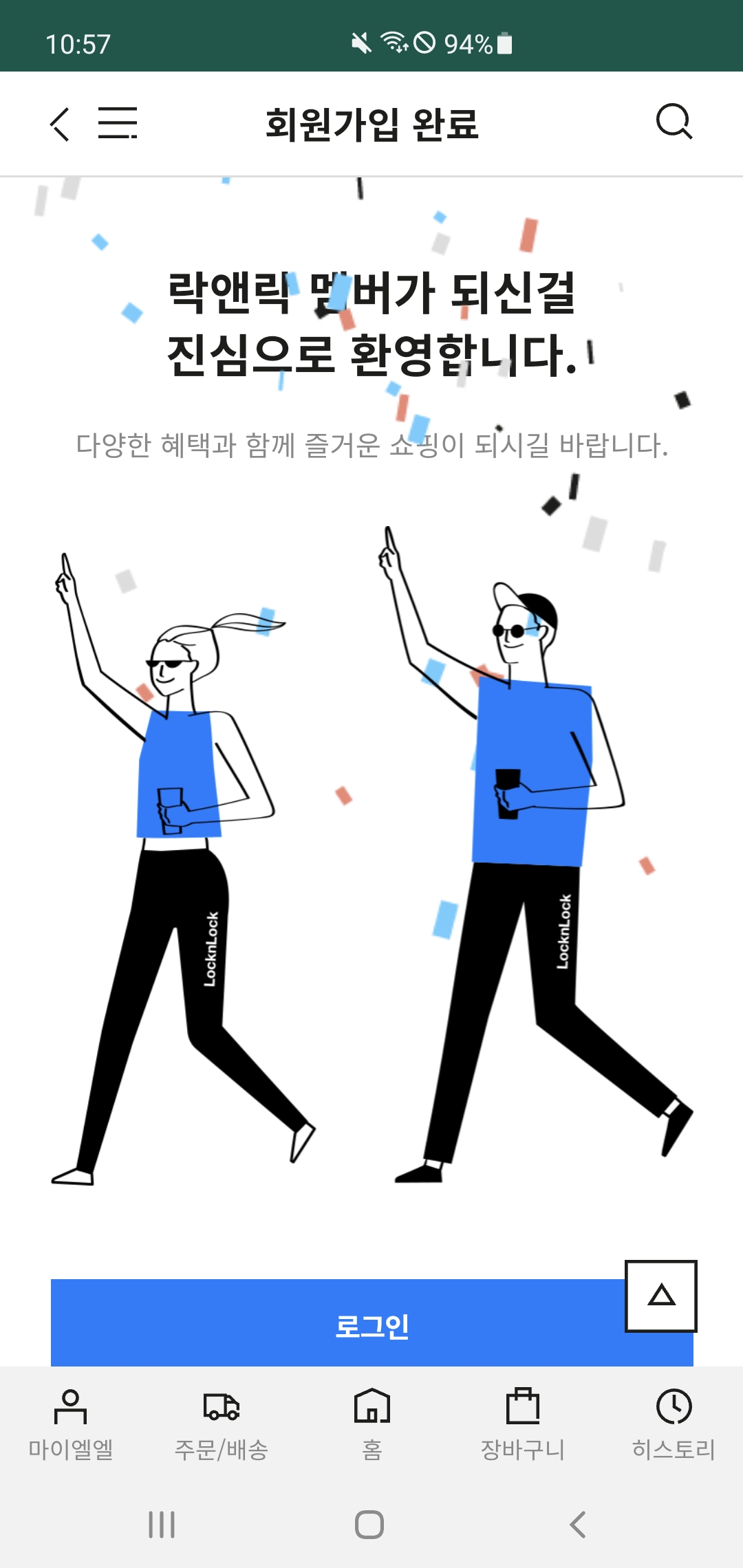 구글 플레이 스토어에서 락앤락몰 앱을 설치하고 실행한다. 락앤락몰 앱 실행 화면에서 좌측 하단에 있는 '마이엘엘'을 클릭하고, 로그인 페이지에서 '회원가입'을 누른다.