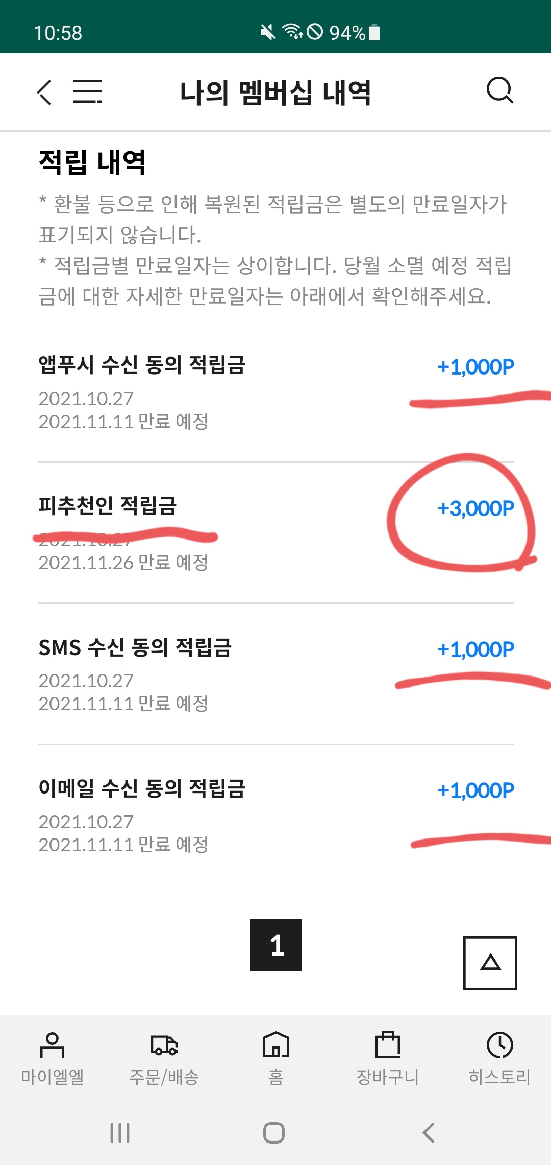 가입을 완료하면 적립 내역에서 6,000P가 있는 것을 확인할 수 있는데, 앞에서 체크한 SMS/이메일/앱푸시 수신동의 적립금 3,000P와 추천인 적립금 3,000P를 합한 금액이다.