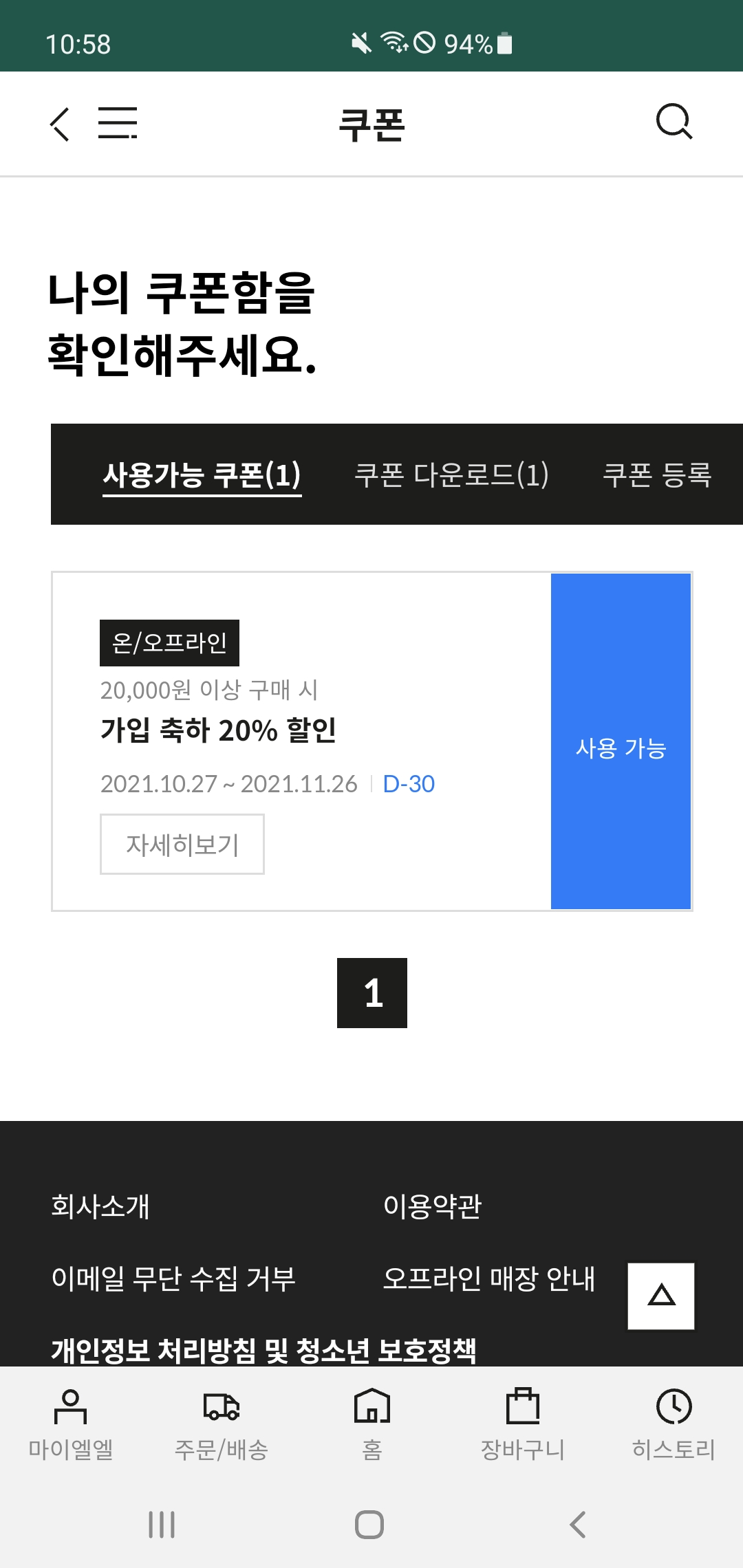 그리고 신규 회원에게 가입 축하 20% 할인 쿠폰도 무료로 제공한다. 20,000원 이상 구매 시 30일 동안 사용할 수 있는 20% 할인 쿠폰이다. 적립금 6,000원과 20% 할인 쿠폰을 사용하면 상당히 저렴하게 구매할 수 있으니 필요한 상품이 있다면 락앤락몰에서 구매해 보자~!