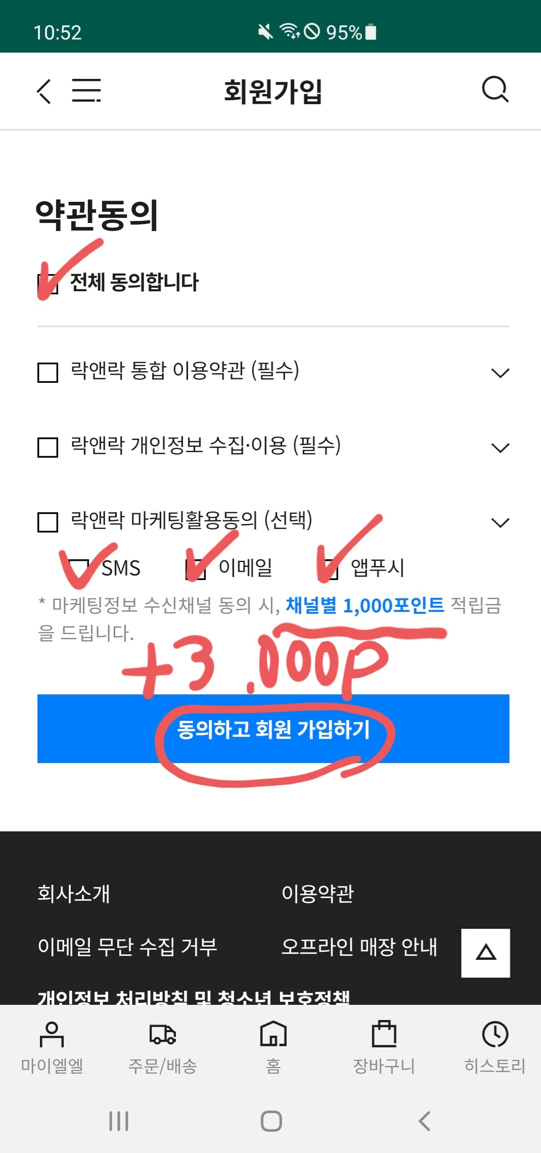 락앤락 통합회원 가입을 진행하려면 휴대폰 본인 인증을 해야 한다. 휴대폰 인증 후 약관에 동의하게 되는데, 여기 락앤락 마케팅활용동의 (선택)에서 SMS/이메일/앱푸시 3개를 모두 체크하면 채널별 1,000포인트를 추가로 받을 수 있다.