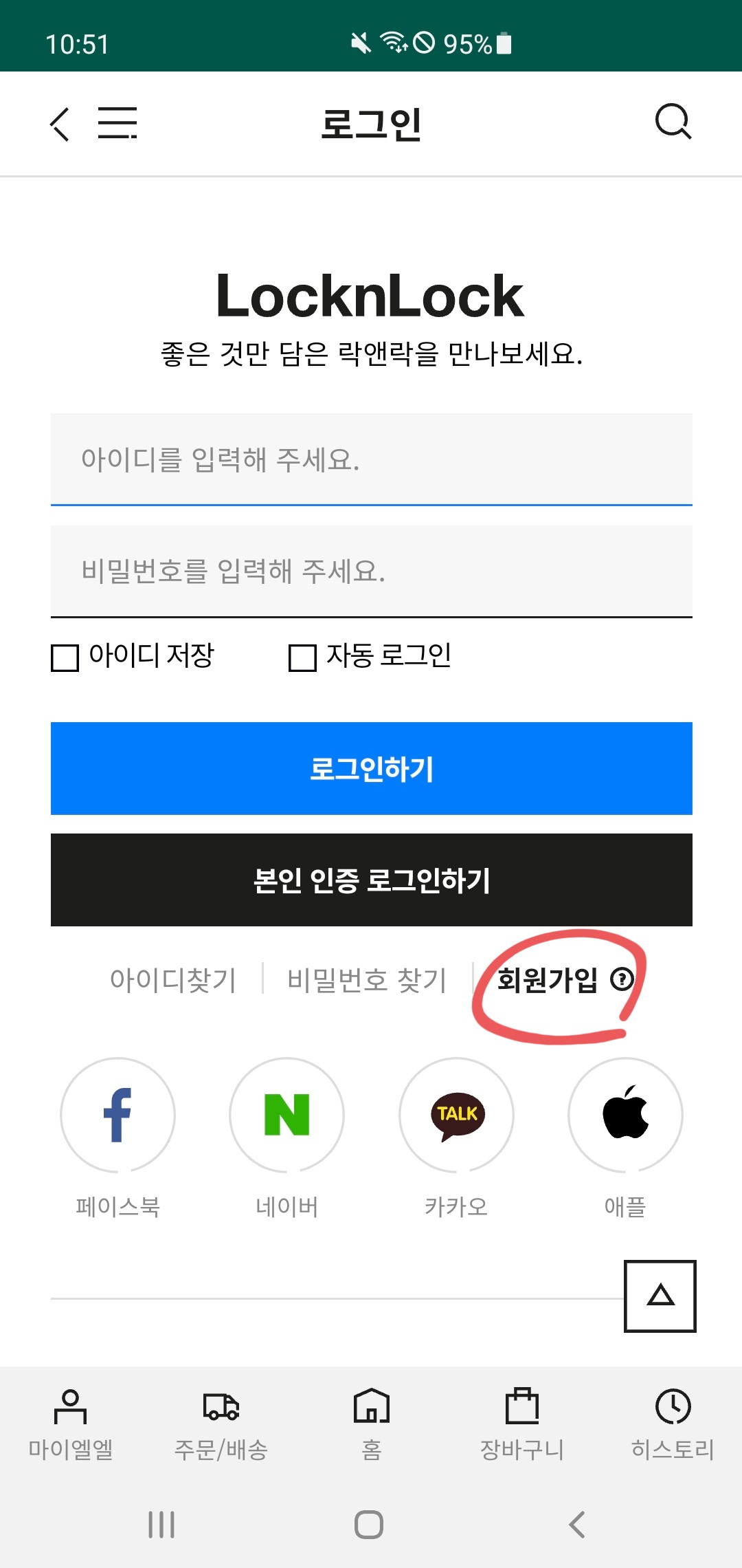 ☞ 락앤락몰에 가입할 때, 페이스북/네이버/카카오/애플 계정으로 가입하면 추천인을 입력할 수 없다는 내용은 확인할 수 없었지만, 혹시 모르니 '회원가입'으로 가입하는 것을 추천한다. 종종 쇼핑몰 앱 중에서 소셜 로그인 계정으로 가입하면 추천인을 입력할 수 없는 경우가 있다.