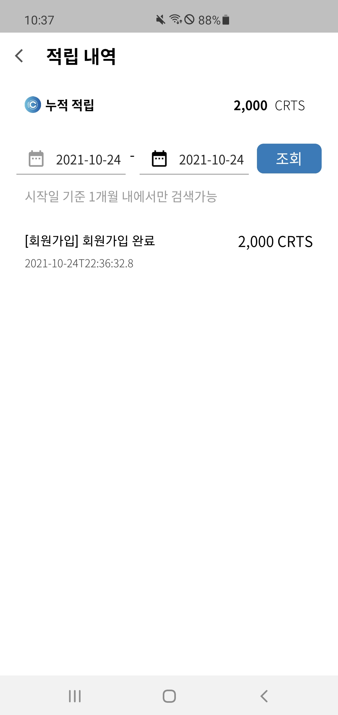 5. 동의하고 가입 후 적립 내역에 보면 회원가입 완료 보상으로 2,000CRTS 지급된 것을 확인할 수 있음!