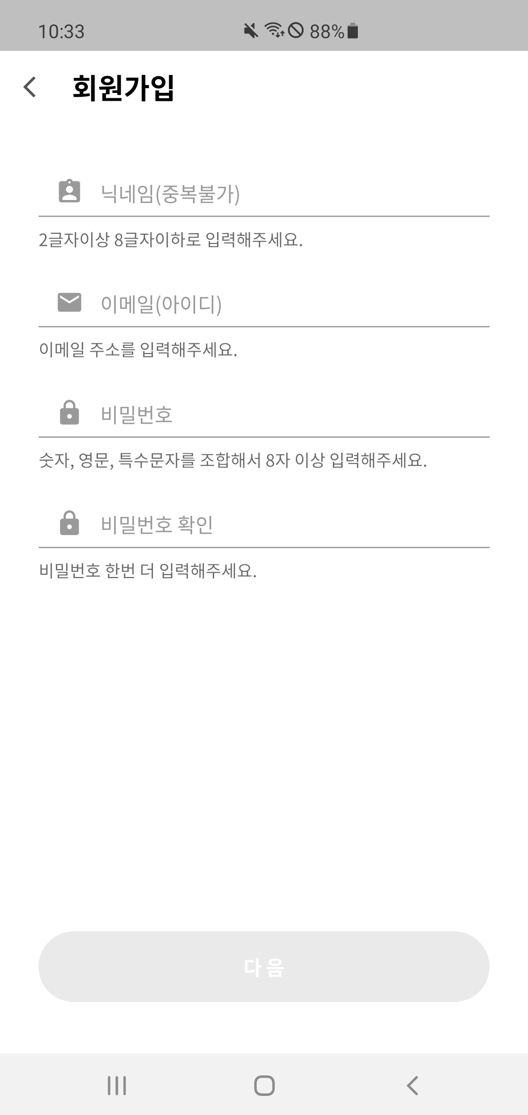 - 닉네임, 이메일, 비밀번호 입력 후 다음 터치