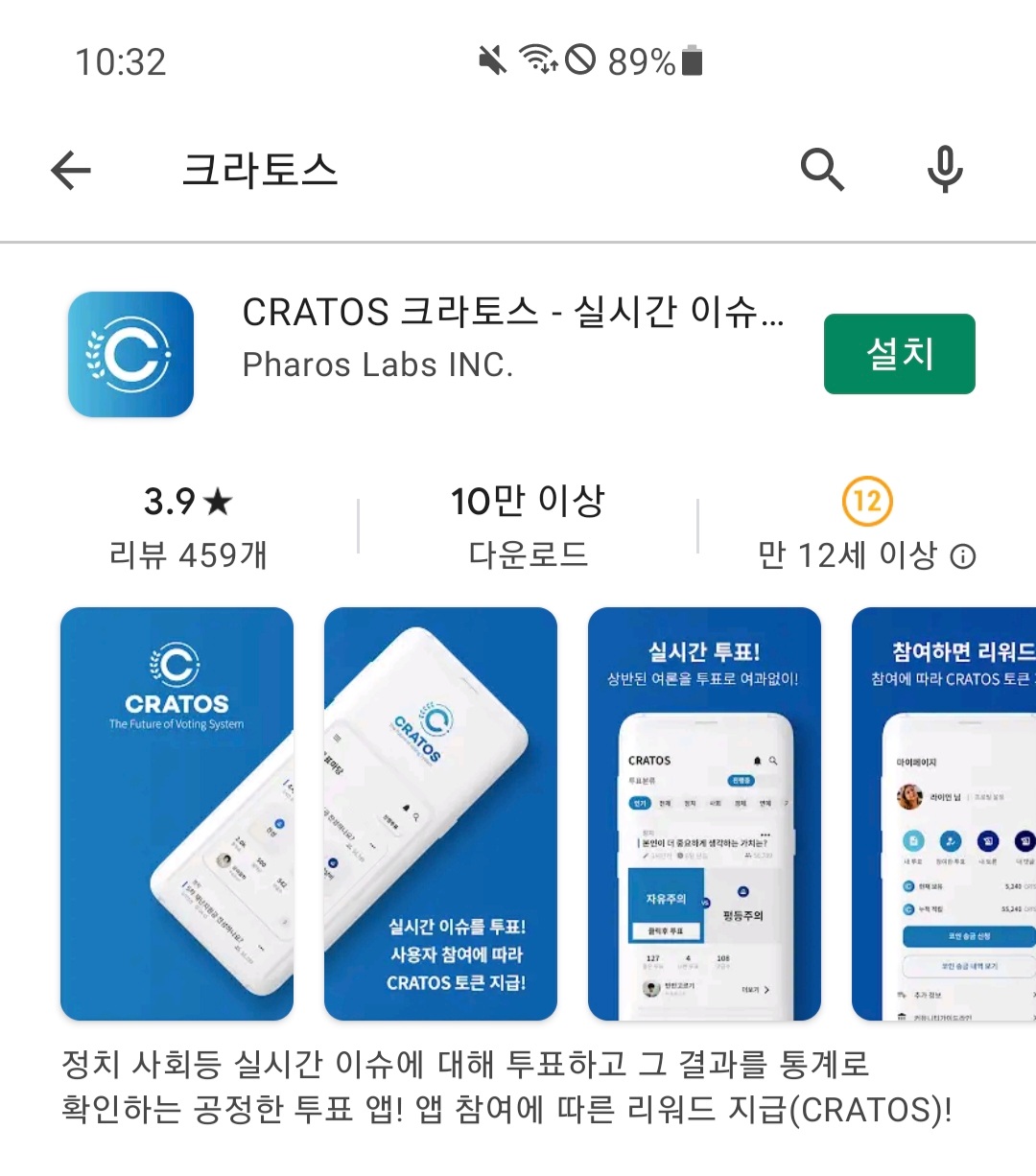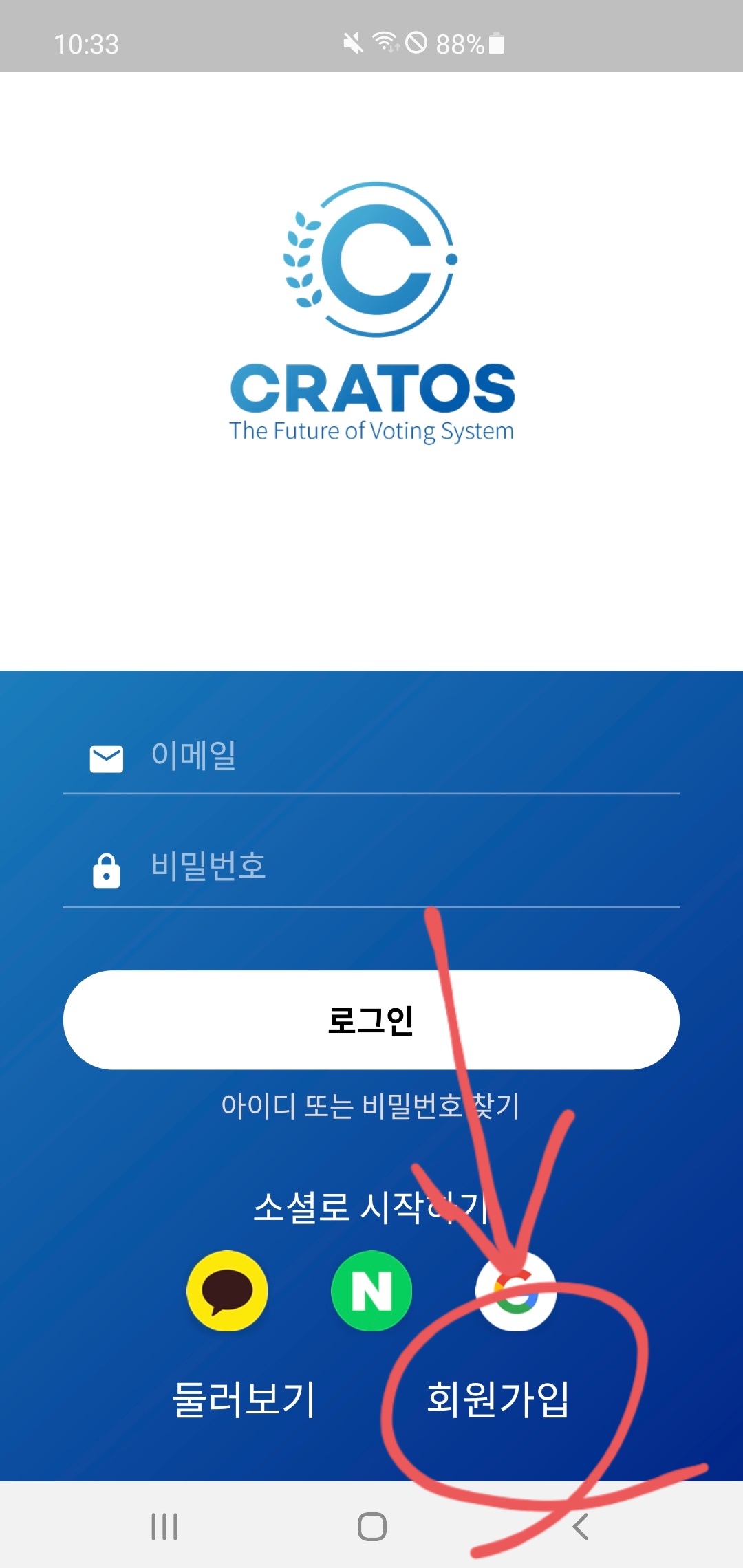 - 구글 플레이 스토어/애플 앱스토어에서 CRATOS or 크라토스 검색 후 앱 설치하고 실행하기