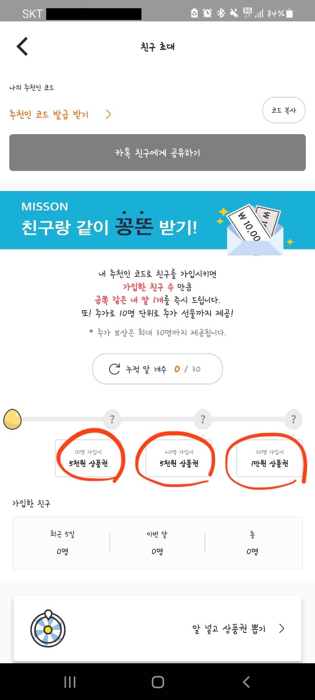 1) 친구를 한 명 초대할 때마다 지급되는 금쪽 같은 내 알을 1개씩 낱개로 깨서 마일리지를 얻는 방법