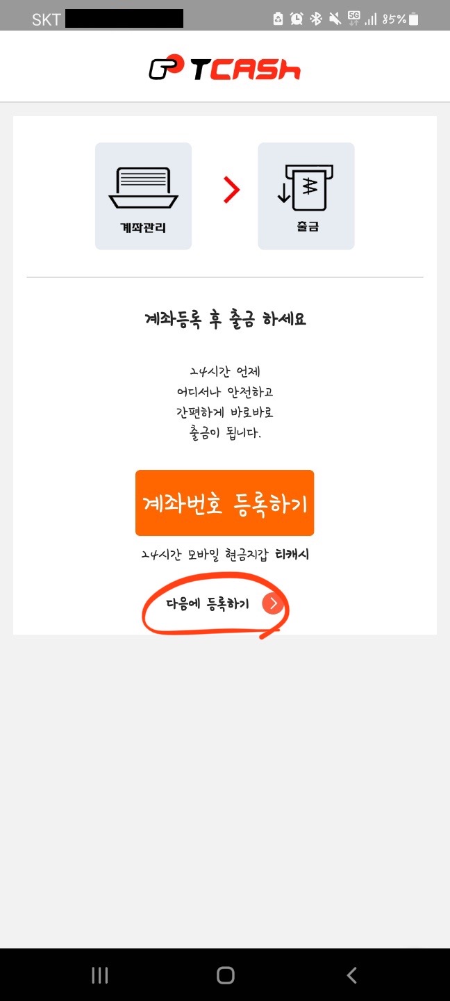계좌를 등록하라는 페이지가 등장하는데 아래의 "다음에 등록하기"를 누르면 입력하지 않고 넘어갈 수 있다.