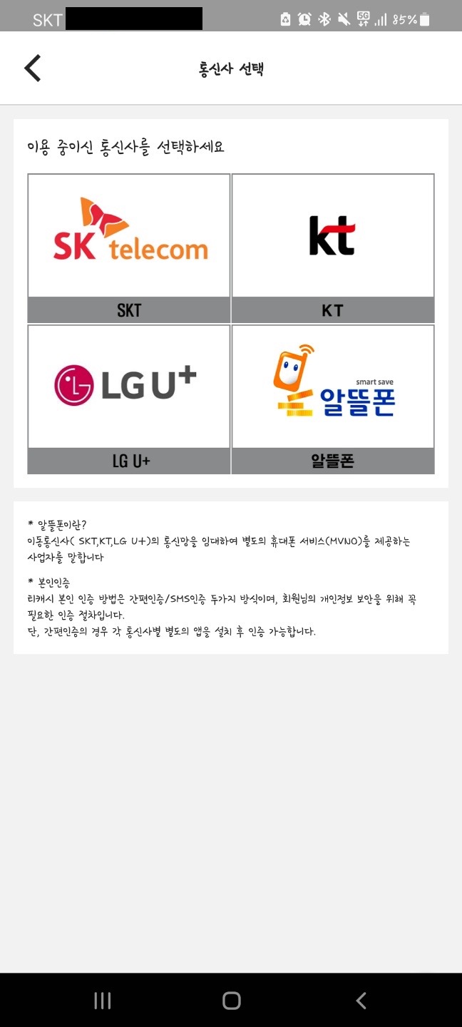서비스 이용약관 동의 후, 휴대폰 본인 인증을 진행한다.